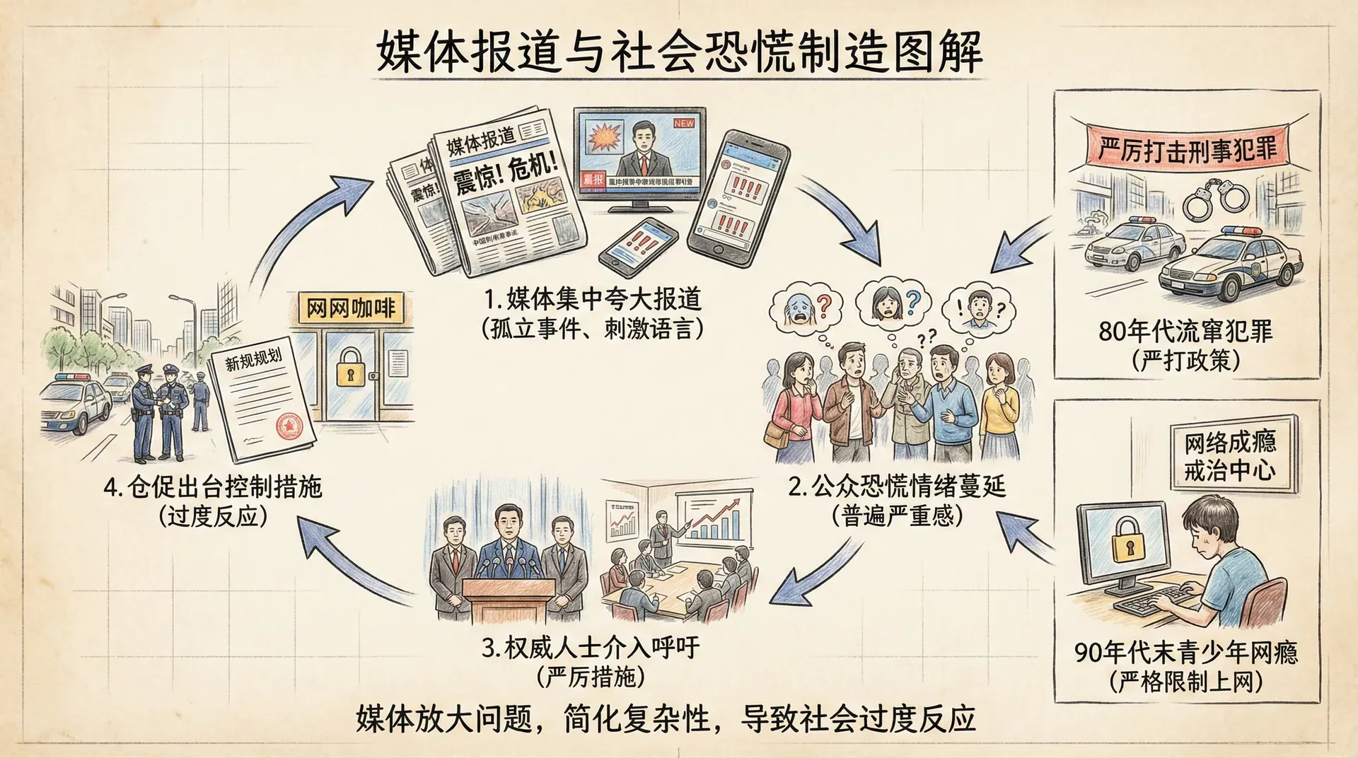 中国也曾出现过类似的恐慌现象。20世纪80年代,媒体对流窜犯罪的集中报道,引发了全社会对社会治安的担忧,推动了严打政策的实施。90年代末,媒体对青少年网瘾和网络犯罪的密集报道,导致社会对网络的过度恐惧和对青少年上网行为的严格限制。这些恐慌虽然基于真实的社会问题,但媒体报道放大了问题的严重程度,简化了问题的复杂性,导致了过度反应。