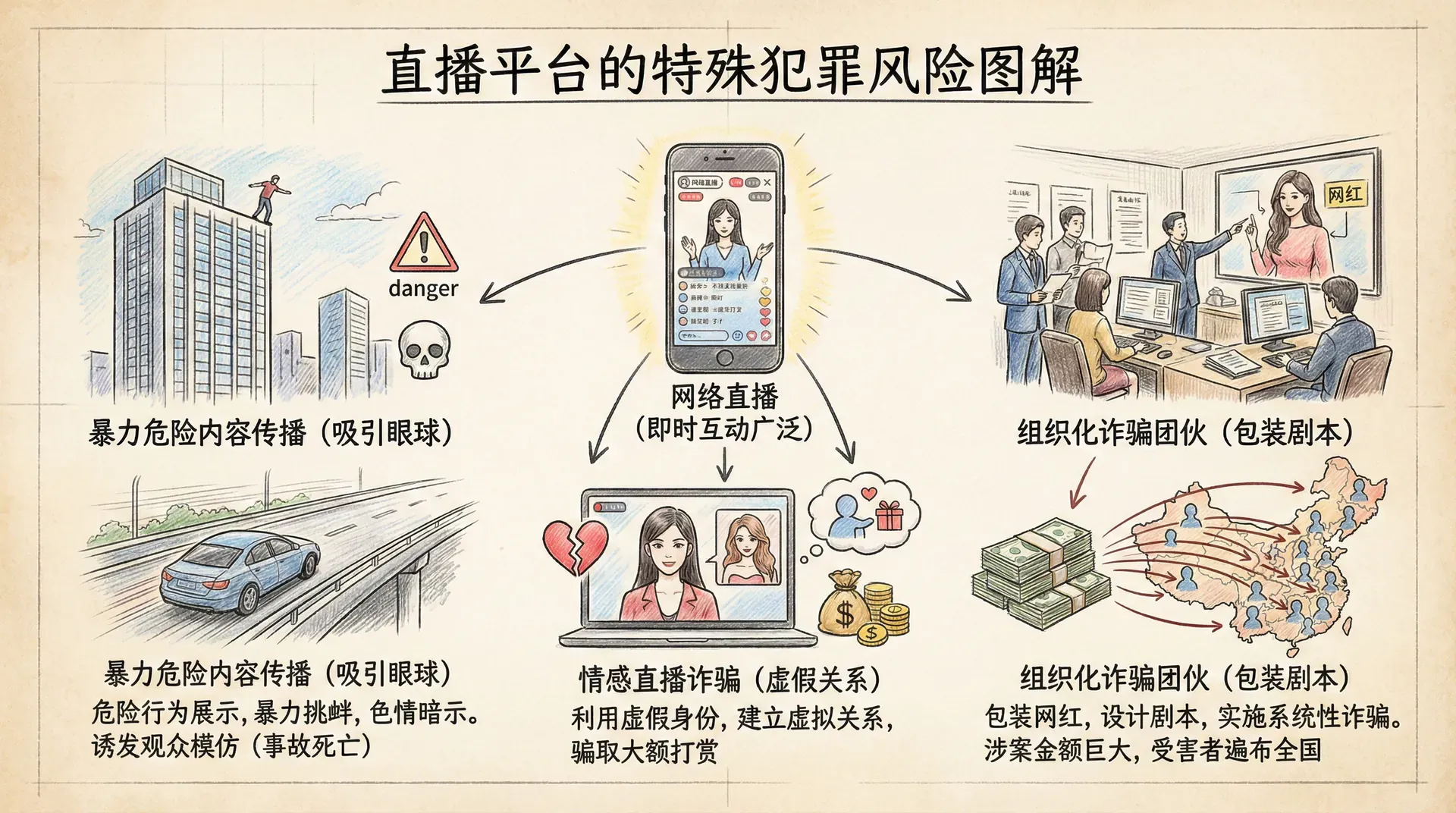 网络直播作为新兴媒体形态,在带来娱乐和商业机会的同时,也产生了独特的犯罪风险。直播的即时性、互动性、广泛性,使其成为传播违法内容、实施网络欺凌、进行诈骗犯罪的新渠道。