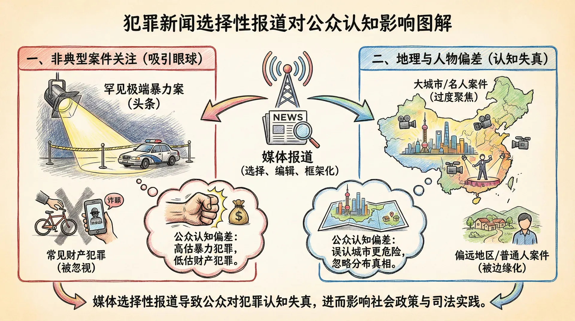 媒体的议程设置功能使其能够通过选择报道内容,影响公众认为什么问题重要。当媒体大量报道某类犯罪时,公众会认为这类犯罪是严重的社会问题,从而推动政策关注和资源投入。
