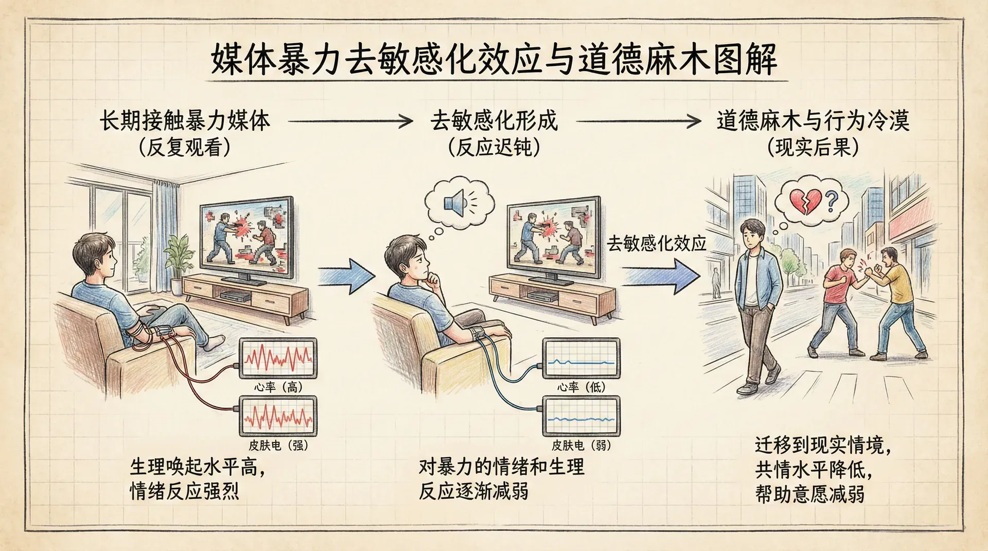去敏感化不仅削弱对暴力的情绪反应,还可能改变个体对暴力严重性的认知评估,使其低估暴力行为的危害性和道德可谴责性。