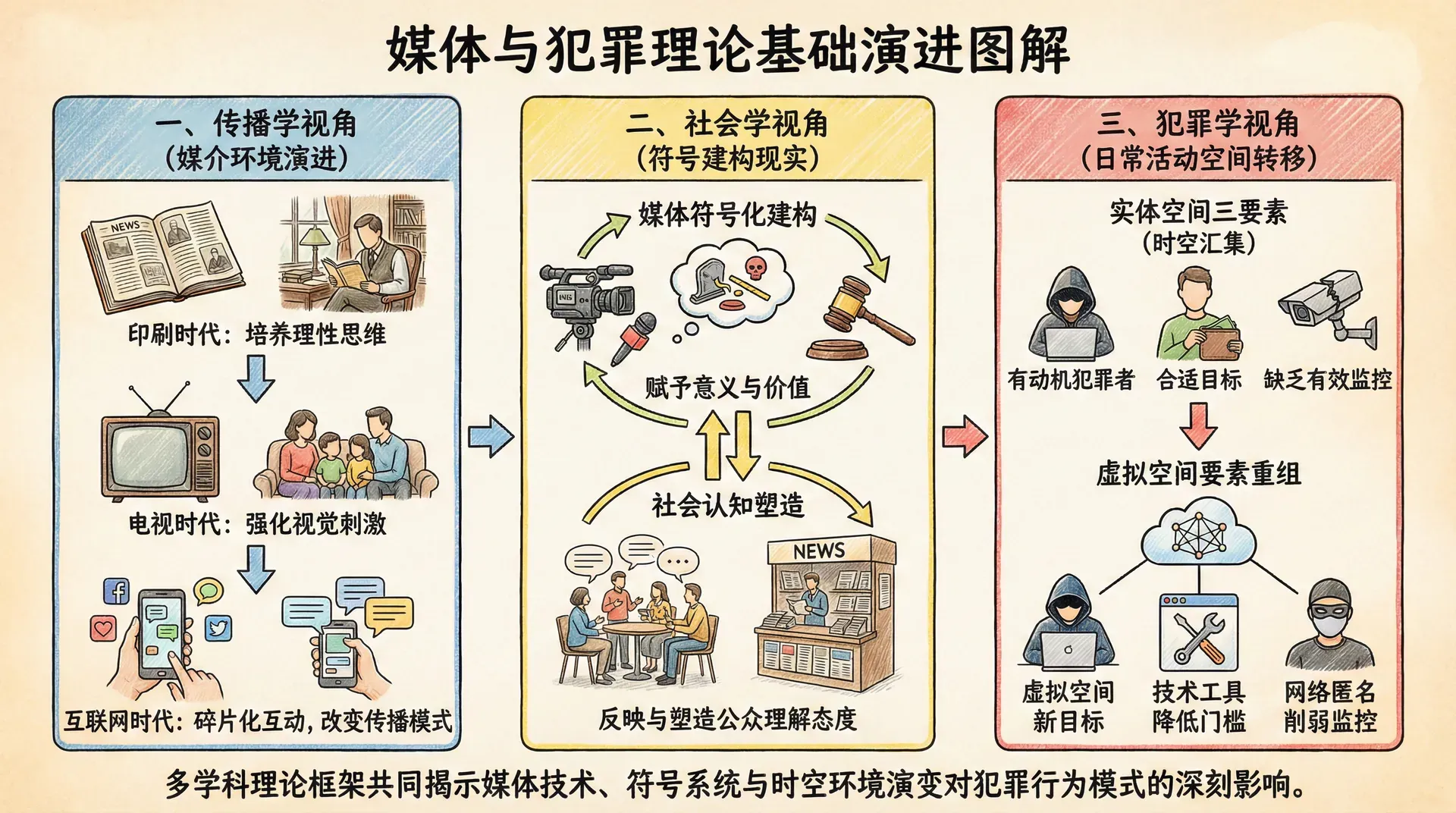 从犯罪学角度,日常活动理论提供了分析媒体环境与犯罪机会的框架。犯罪的发生需要三个要素在时空上汇集:有动机的犯罪者、合适的目标、缺乏有效的监控。网络媒体改变了这三个要素的分布。虚拟空间提供了新的犯罪目标,技术工具降低了犯罪门槛,而网络的匿名性削弱了监控效果。