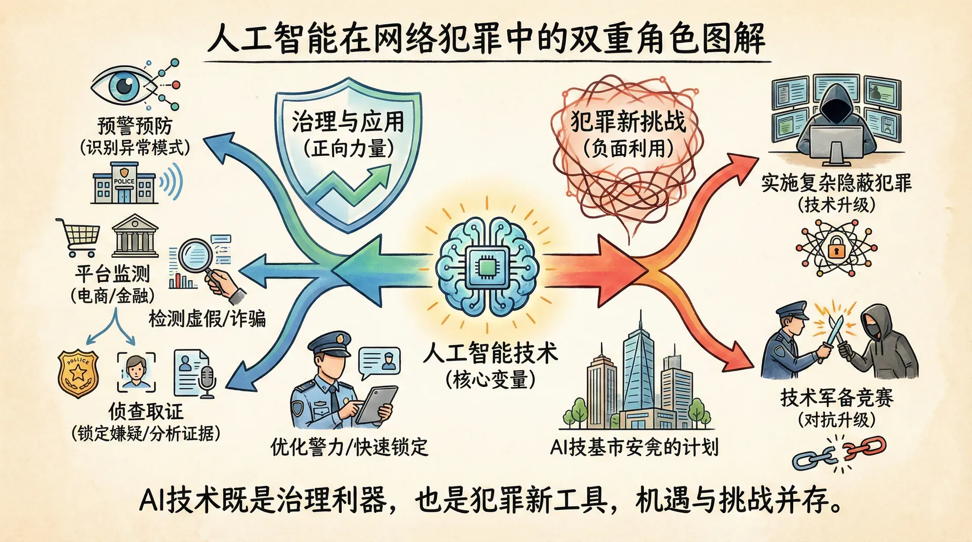 人工智能技术的发展,为网络犯罪治理带来了新的机遇和挑战。一方面,AI技术被广泛应用于犯罪预防和侦查,提高了执法效率。另一方面,犯罪分子也在利用AI技术实施更复杂、更隐蔽的犯罪,形成了技术军备竞赛。
