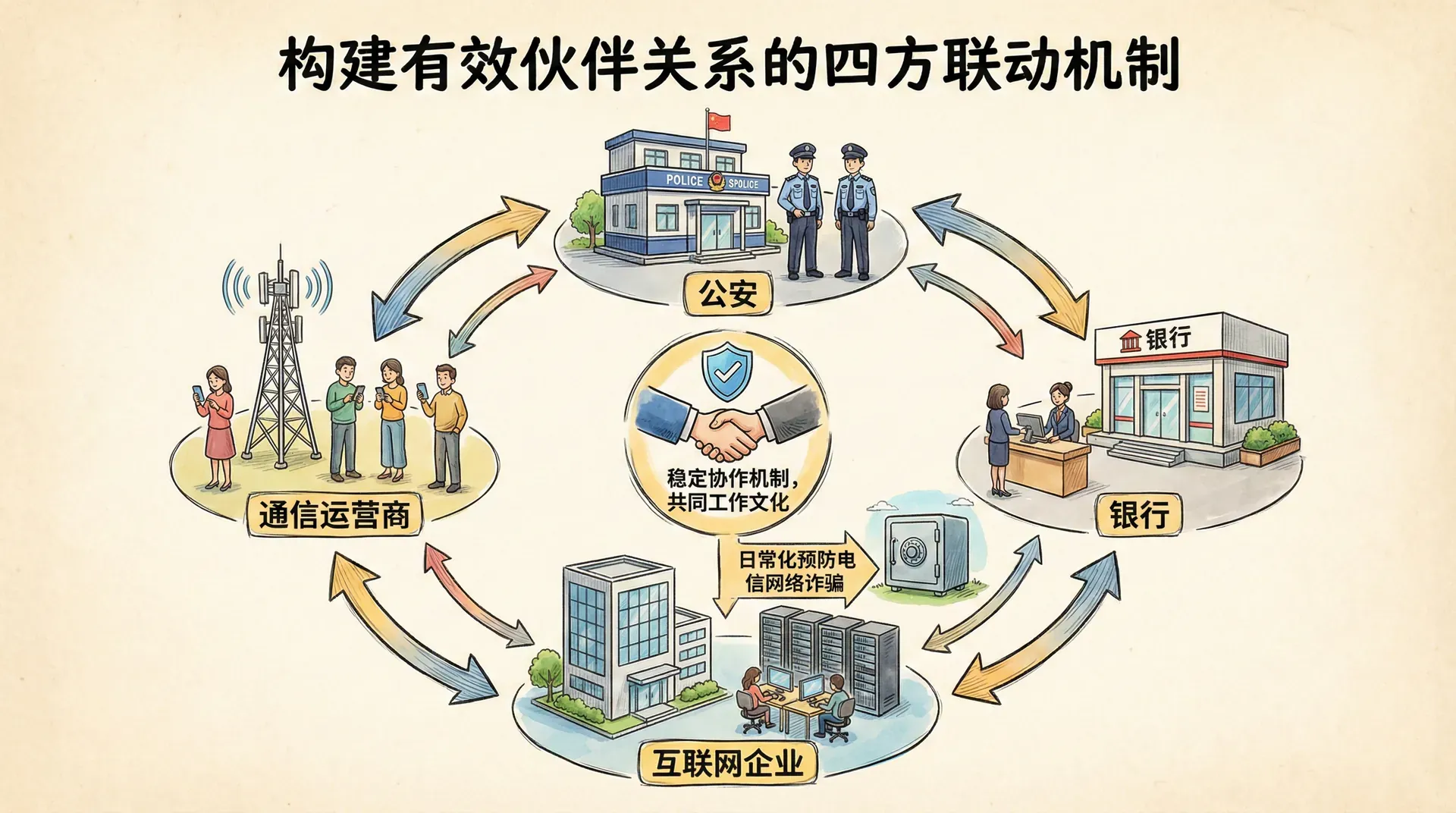 建立伙伴关系不是简单地把各部门凑在一起开会,而是要形成稳定的协作机制和共同的工作文化。2020年北京市朝阳区在预防电信网络诈骗工作中,公安、银行、通信运营商、互联网企业建立了"四方联动"机制。这一机制的核心不是临时性的联合行动,而是建立了日常化的工作联系。