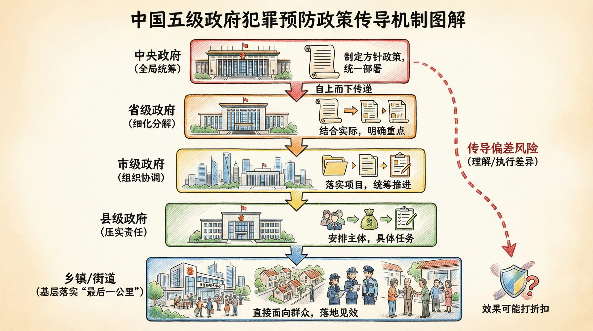 政策传导衰减的原因是多方面的。上级政策往往比较原则、比较宏观,需要结合本地实际细化实化。在这个过程中,如果理解不准确、把握不到位,就可能偏离方向。各级政府都有自己的重点工作和考核压力,犯罪预防如果不是核心考核指标,容易被边缘化。基层政府资源有限,面对多项任务,难免顾此失彼。此外,层级越多,信息衰减越严重,上级的意图到了基层可能已经面目全非。