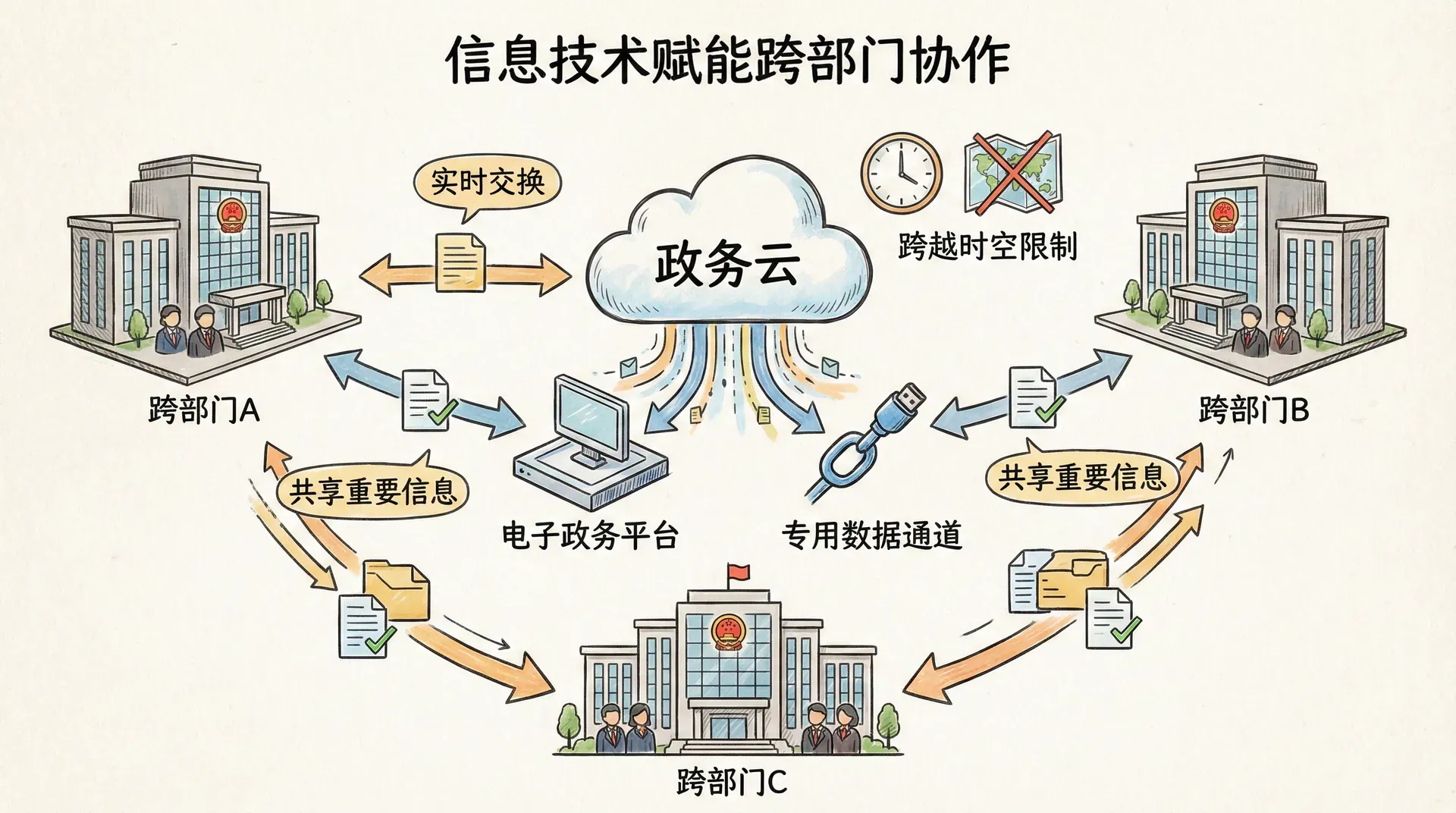 现代信息技术为跨部门协作提供了强大的支撑。首先,电子政务平台、政务云和专用数据通道使各部门能够不受地域和时间限制,实时交换、共享重要信息,实现业务数据的联通。