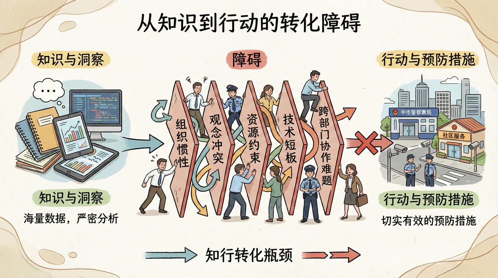 从知识到行动之间并非一帆风顺,而是充满了复杂的障碍和挑战。即使我们已经收集和掌握了海量的数据资源,依靠严密的分析获得了深刻的洞察,也并不意味着这些知识和信息能够顺利地被转化为切实有效的预防措施。在实际工作中,将知识转化为行动往往会遭遇组织惯性、观念冲突、资源约束、技术短板、跨部门协作难题等诸多问题。每一个环节都可能成为“知行转化”的瓶颈,导致数据和洞察停留在纸面,无法成功落地到现实的工作流程中。因此,知识到行动的转化是一个需要持续努力、系统集成、多方配合的复杂过程。