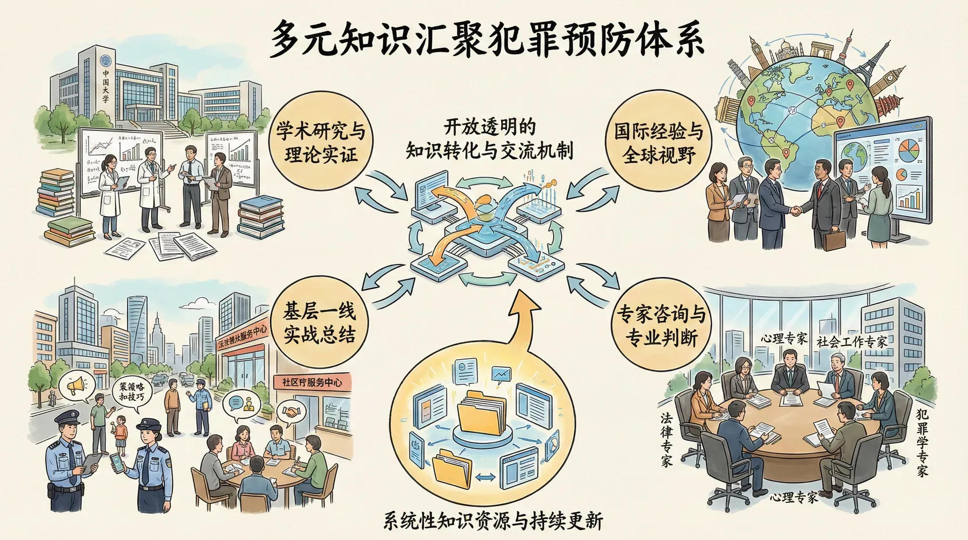 此外,邀请犯罪学、社会工作、法律、心理等领域的专家咨询,可以为政策制定和复杂问题的应对提供专业的、多维度的判断与建议。要充分激发这些不同渠道的知识价值,关键还在于搭建开放透明的知识获取、整理、转化与交流机制,将零散、分散的理论、实务和经验沉淀为可被广泛借鉴与持续更新的系统性知识资源,从而不断提升犯罪预防工作的科学性与针对性。
