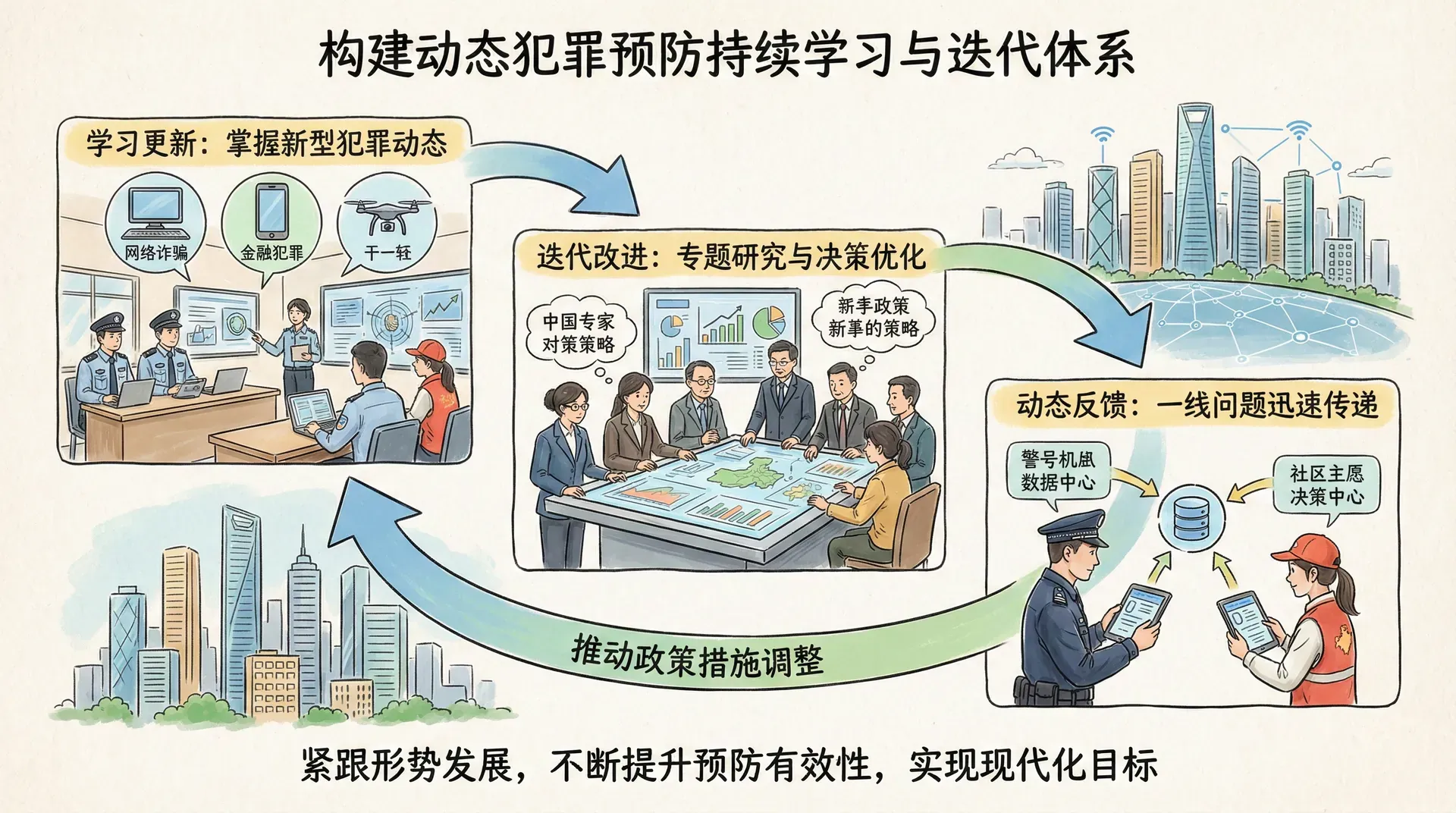 因此,有必要建立一套完善的持续学习和迭代改进机制。这套机制既包括对一线执法人员、社区工作人员、社会参与群体的定期培训,也包括针对实际案例开展专题研究、经验交流,及时将研究成果纳入防控体系。同时,应建立知识反馈渠道,让前线发现的新风险、新问题能够迅速传递到决策和预防体系中,推动政策和措施的及时调整。只有通过这种动态更新与持续迭代,才能确保预防体系始终紧跟犯罪形势的发展步伐,不断提升犯罪预防和干预的有效性,实现知识驱动下的高效、现代化犯罪预防目标。