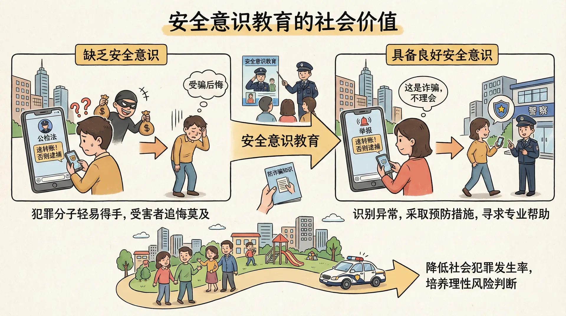 安全意识教育的核心不在于告诉公众犯罪有多可怕,而在于教会他们如何在日常生活中识别风险、避免危险,并在必要时采取正确的应对措施。