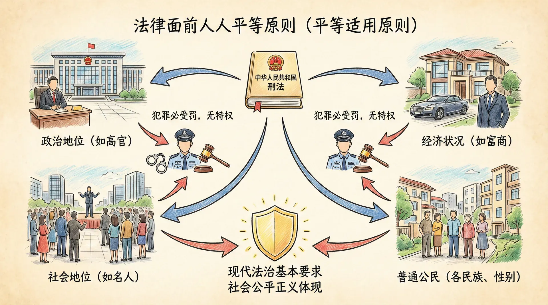 这些规定确立了刑法平等适用的宪法基础和法律依据。平等适用原则不仅是一种法律原则,更是社会主义法治理念的重要内容,对于维护社会公平正义、增强人民群众对法治的信心具有重要意义。