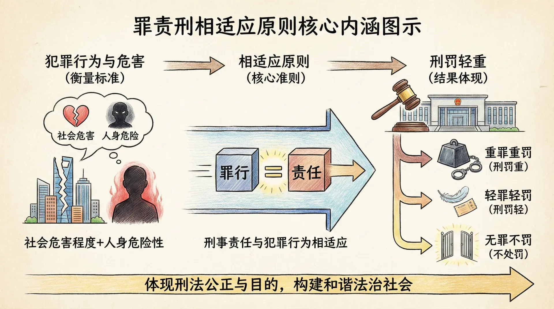 罪责刑相适应原则是指犯罪人所承担的刑事责任应当与其所犯罪行相适应。刑罚的轻重应当与犯罪的社会危害程度和犯罪人的人身危险性相当,做到重罪重罚、轻罪轻罚、无罪不罚。这一原则既是刑法公正性的要求,也是刑法目的性的体现。