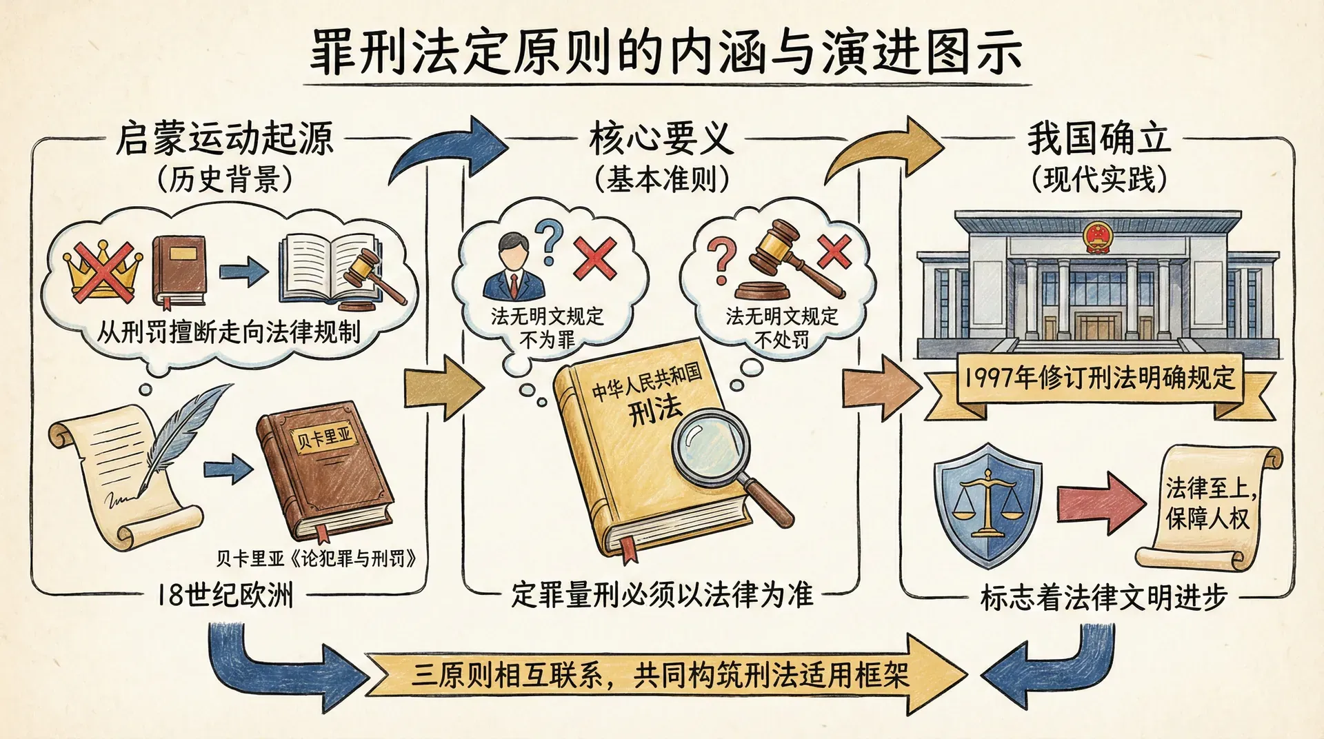 罪刑法定原则起源于18世纪欧洲启蒙运动时期,意大利刑法学家贝卡里亚在《论犯罪与刑罚》中首次系统阐述了这一思想。这一原则的确立,标志着人类刑法文明从"刑罚擅断"走向"法律规制",从"王权至上"走向"法律至上"。我国1997年修订的刑法明确规定了这一原则: