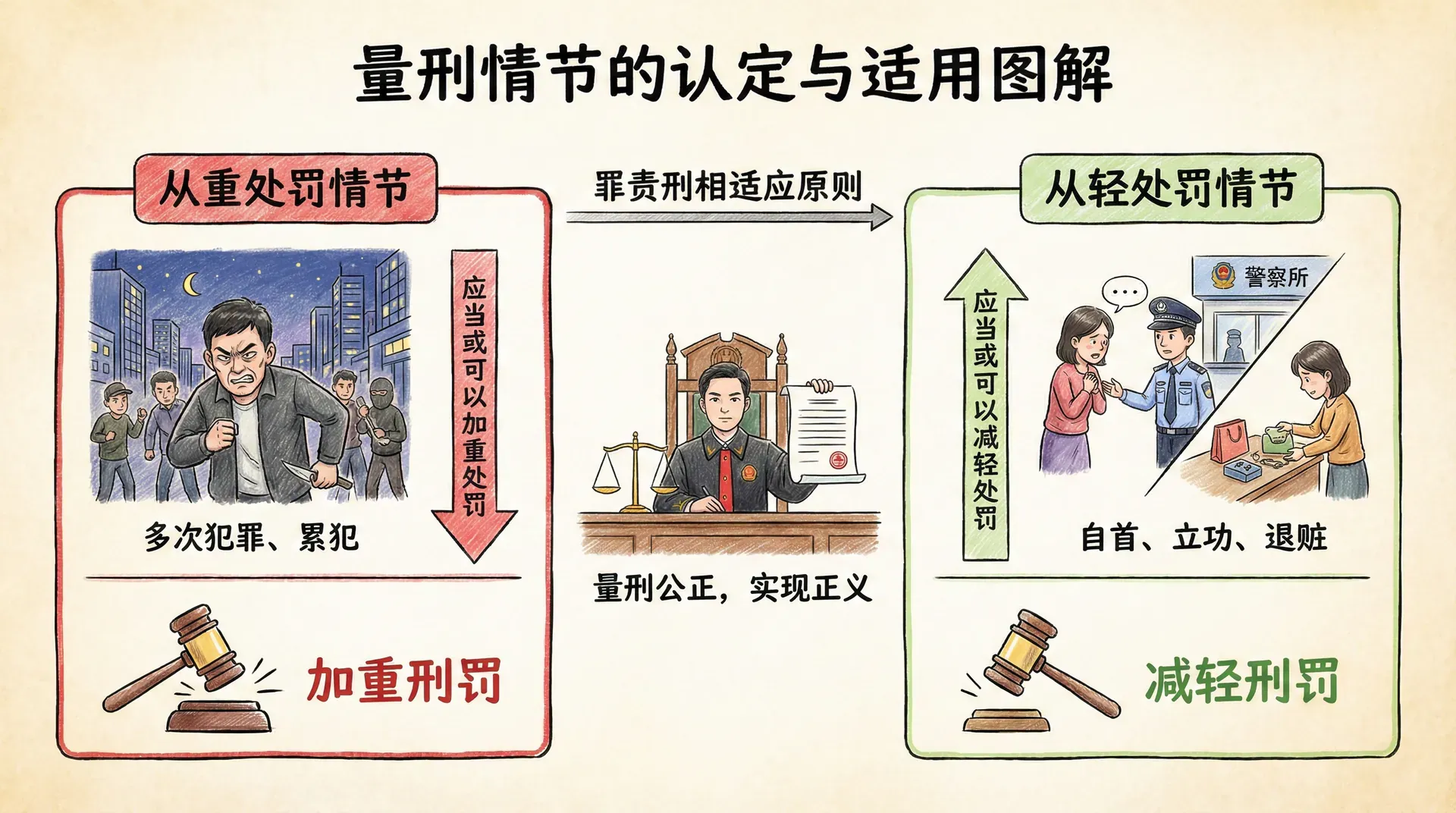 刑法规定了多种从重处罚和从轻处罚情节,这些情节的设置体现了罪责刑相适应原则的要求。从重处罚情节是指法律规定应当或者可以加重处罚的情节,从轻处罚情节则是指法律规定应当或者可以减轻处罚的情节。正确认定和适用这些情节,对于实现量刑公正具有重要意义。