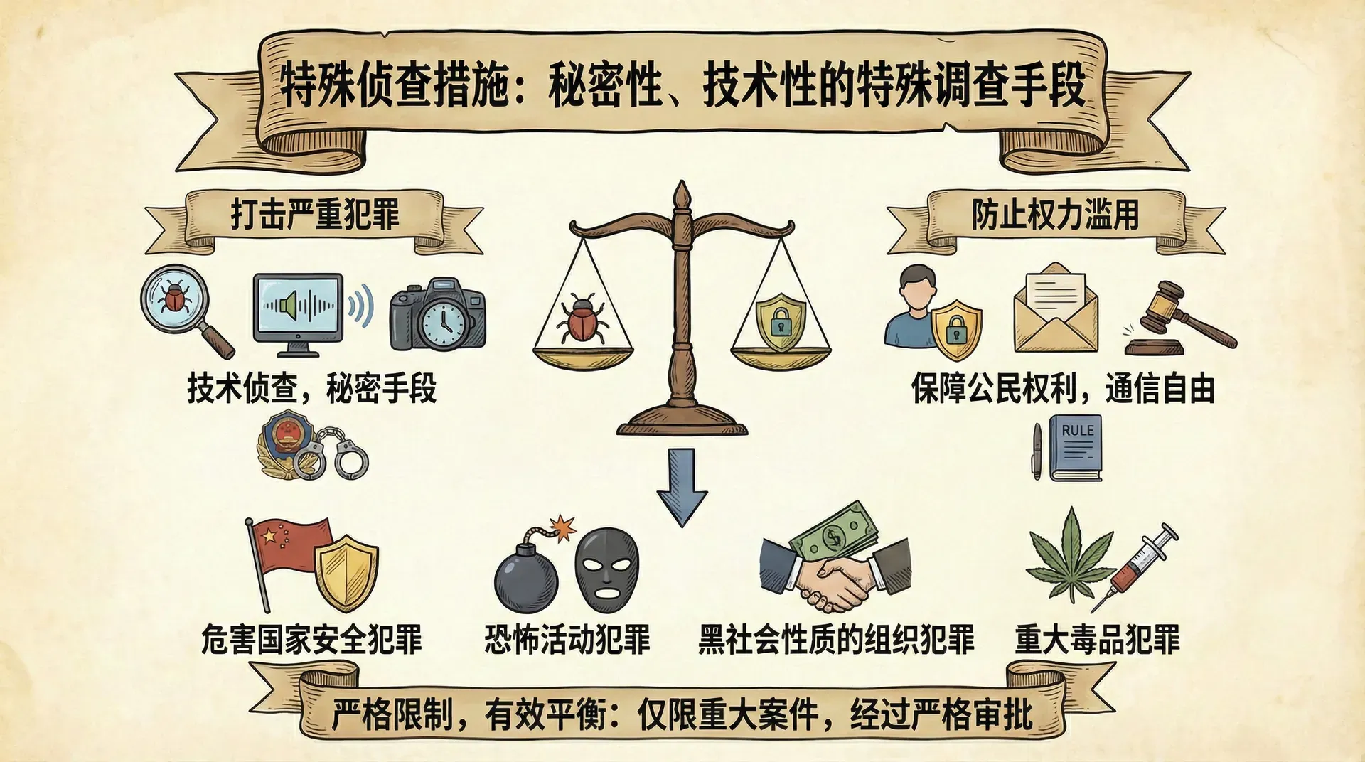 我国刑事诉讼法对特殊侦查措施的规定体现了谨慎、克制的态度。只有在侦破重大案件确有必要的情况下,经过严格的审批程序,才能采取技术侦查等特殊措施。同时,法律明确规定技术侦查措施的适用范围仅限于危害国家安全犯罪、恐怖活动犯罪、黑社会性质的组织犯罪、重大毒品犯罪等严重危害社会的犯罪案件。这一限制性规定,有效平衡了打击犯罪与保障人权之间的关系。