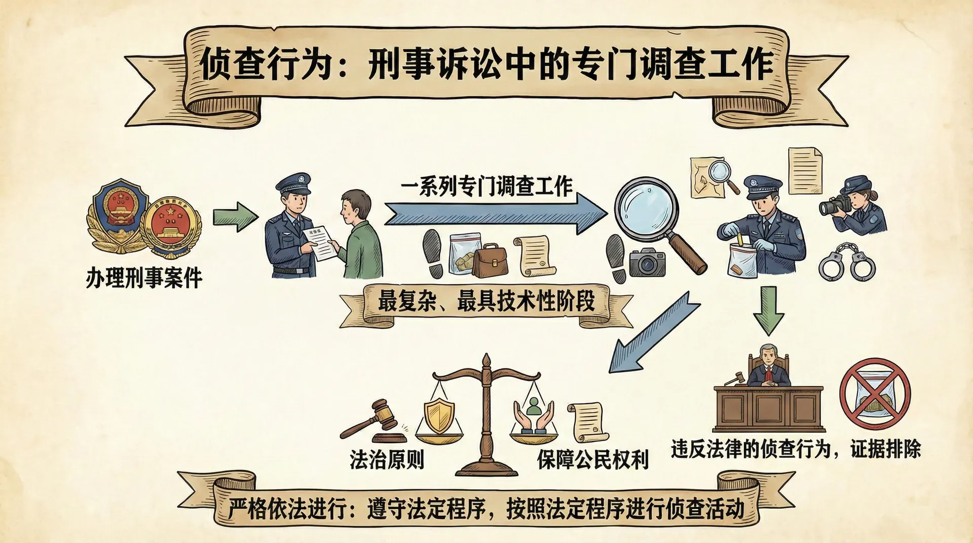 侦查行为必须严格依法进行,这是法治原则在刑事诉讼中的重要体现。侦查人员只能采取法律规定的侦查手段,按照法定程序进行侦查活动。任何违反法律规定的侦查行为,不仅侵犯公民的合法权利,其获取的证据也可能被排除,影响案件的正确处理。
