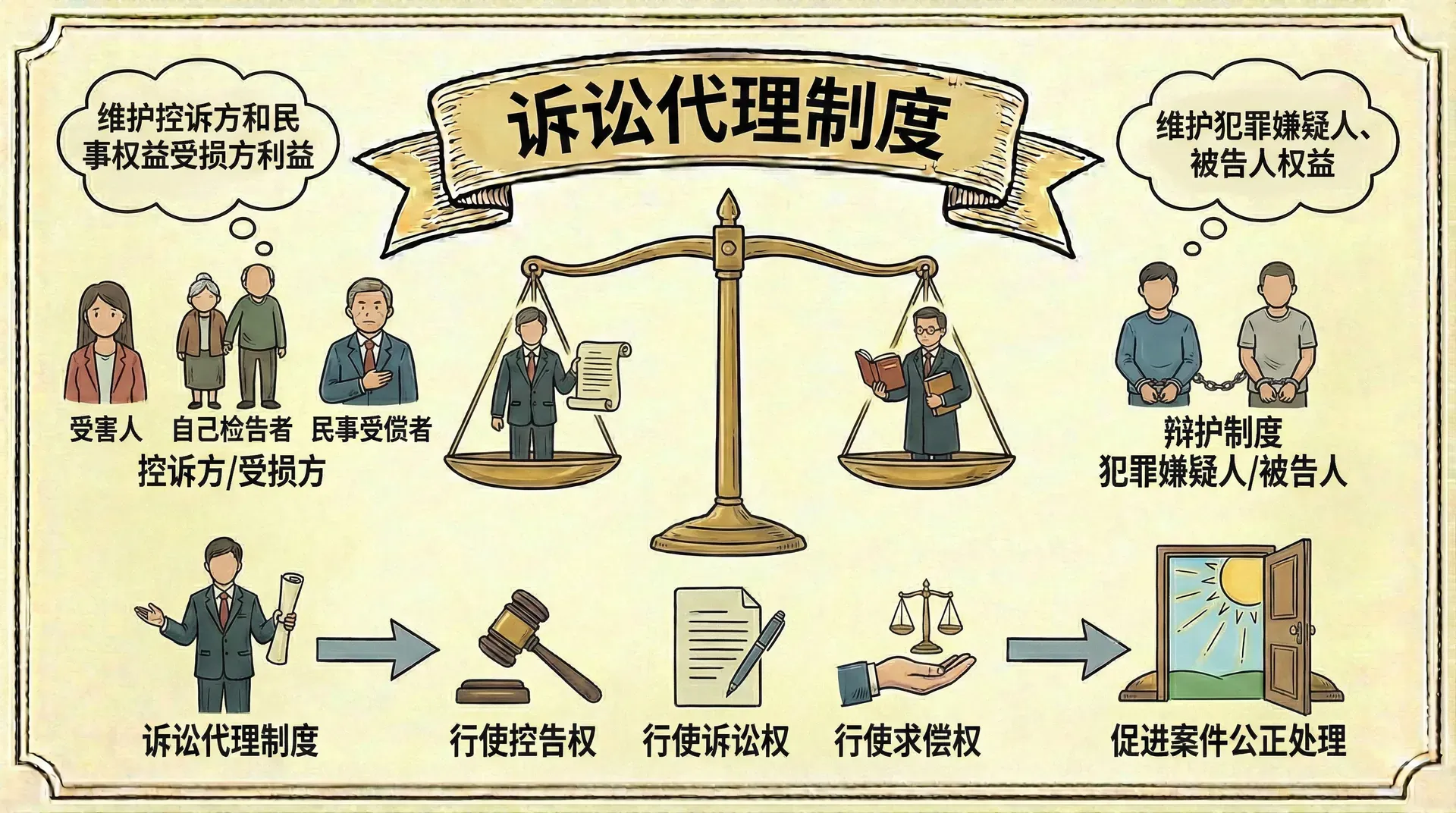 诉讼代理制度是保障被害人、自诉人及附带民事诉讼当事人合法权益的重要制度。与辩护制度主要维护犯罪嫌疑人、被告人权益不同,诉讼代理制度主要维护控诉方和民事权益受损方的利益。通过委托诉讼代理人,这些诉讼参与人可以获得专业的法律帮助,有效行使控告权、诉讼权和求偿权,促进案件的公正处理。