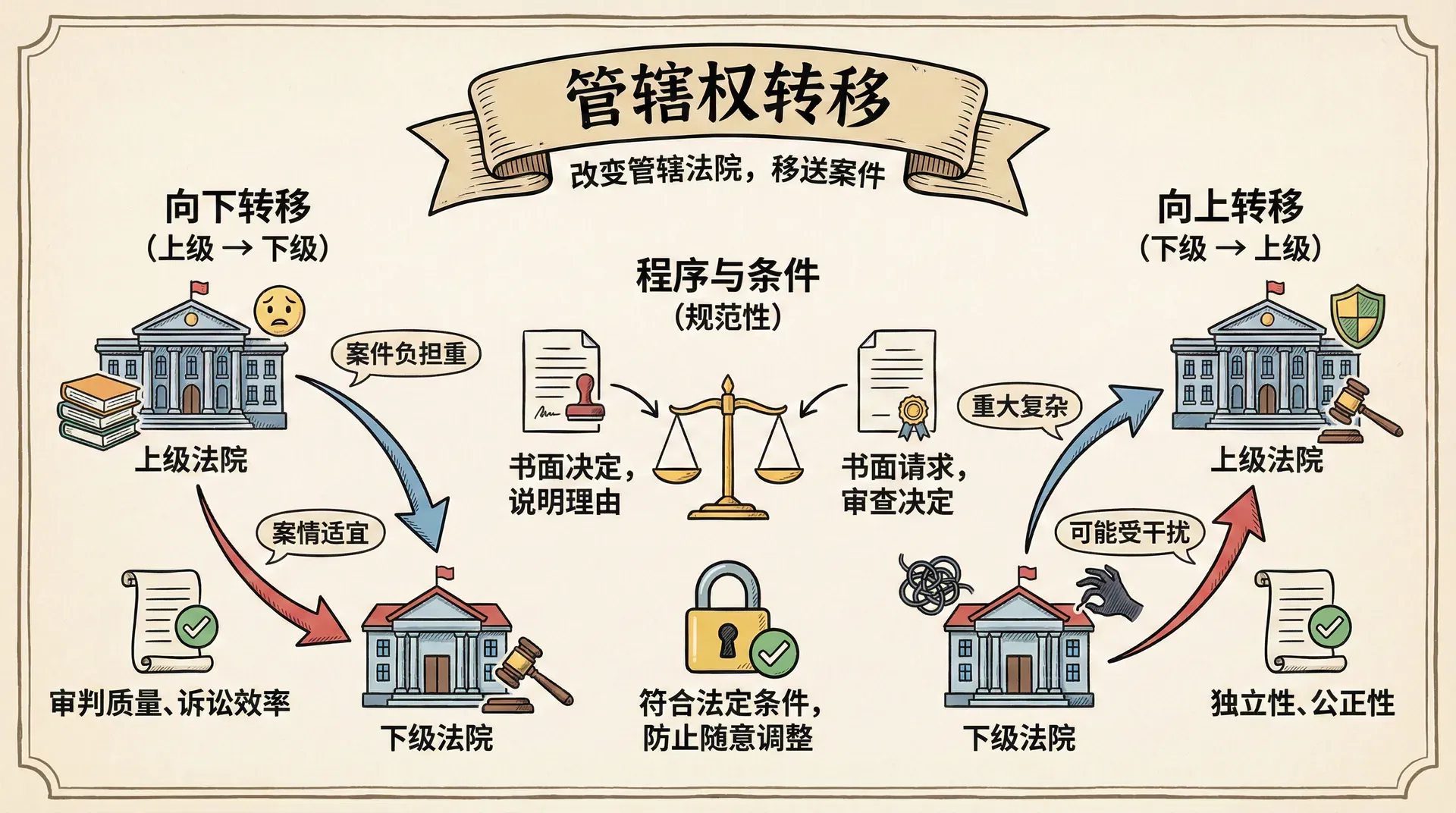 管辖权的分配虽然有明确的法律规定,但司法实践复杂多变,有时需要对管辖权进行调整。管辖权转移就是改变法律规定的管辖法院,将案件移送其他法院审理的制度。