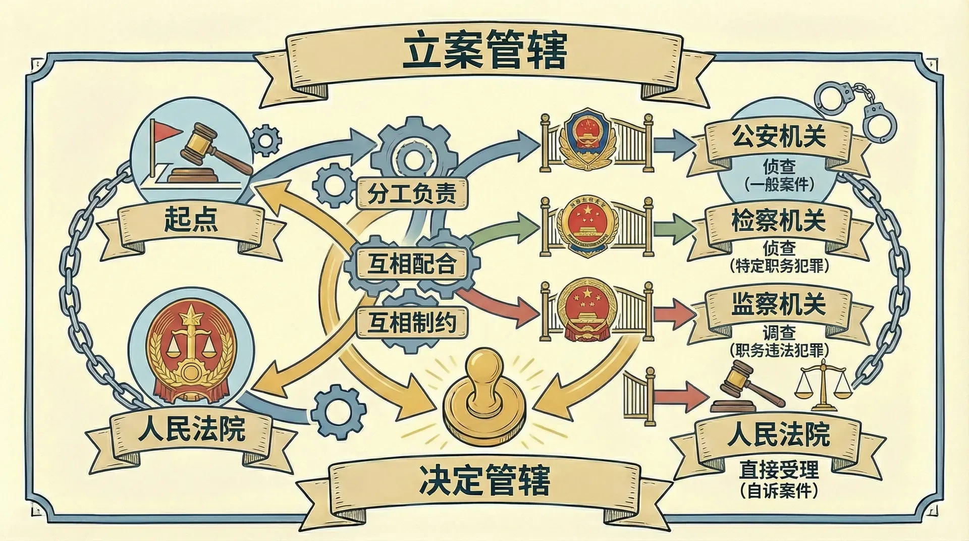 立案管辖是刑事诉讼的起点,决定了案件由哪个机关负责侦查或受理。我国实行分工负责、互相配合、互相制约的原则,根据案件性质的不同,分别由公安机关、检察机关、监察机关负责侦查,或由法院直接受理。