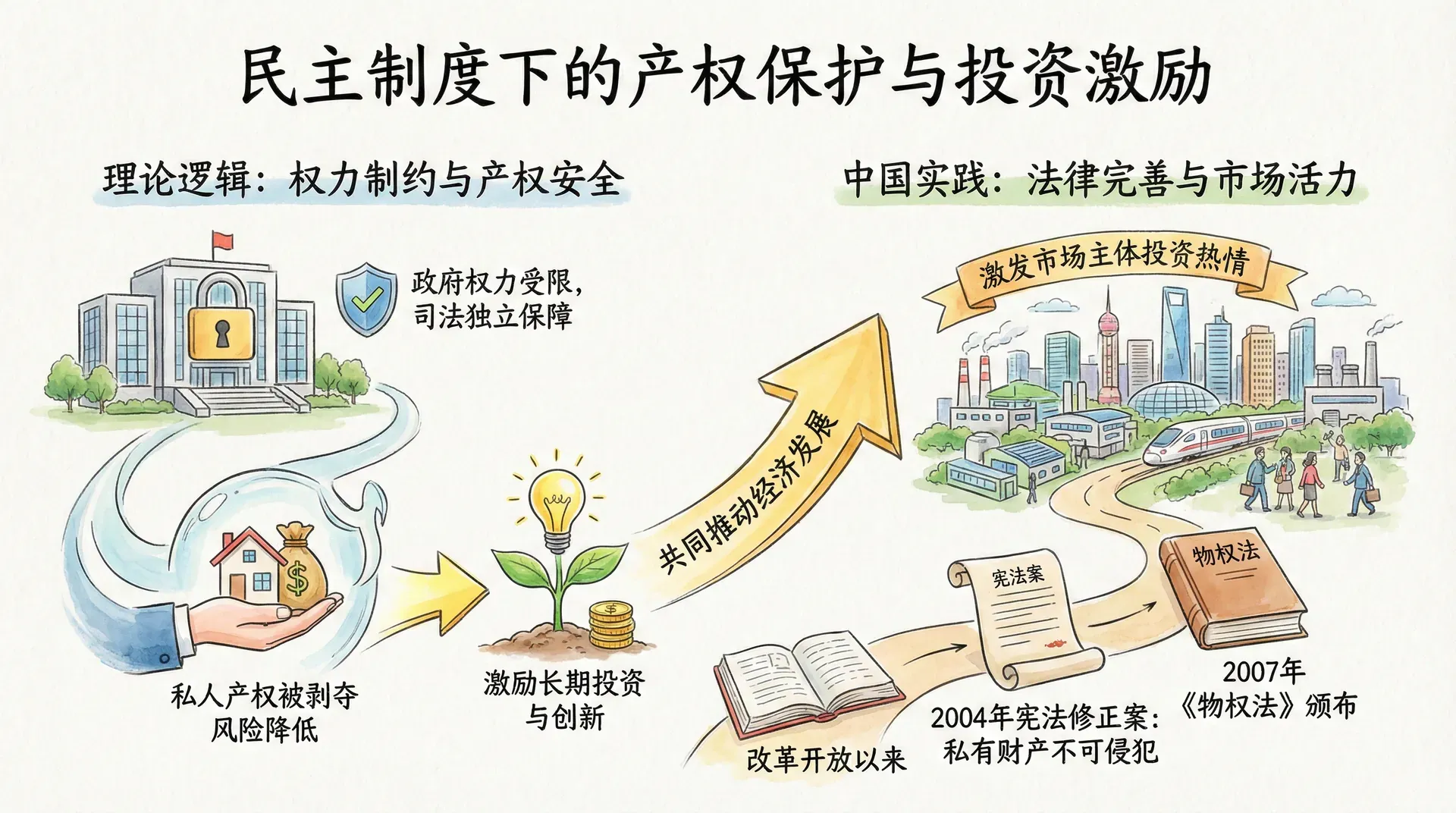 民主制度的一个重要经济效应是加强产权保护。当政府权力受到制约、司法独立得到保障时,私人产权被任意剥夺的风险就会降低,这有利于激励长期投资和创新。