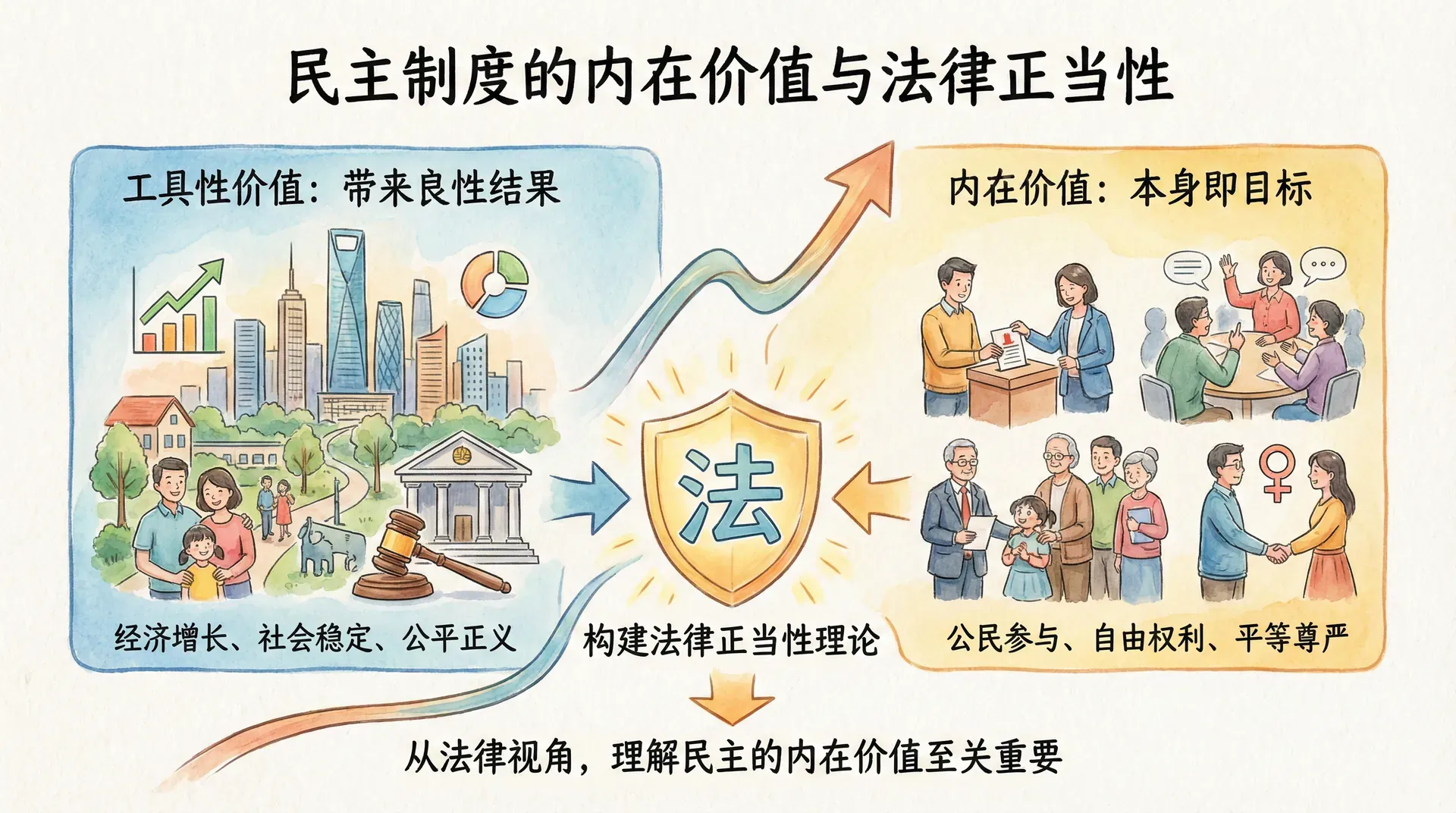 讨论民主的价值需要区分两个层面:工具性价值与内在价值。工具性价值指民主能够带来其他好的结果,如经济增长、社会稳定等;内在价值则指民主本身就是值得追求的目标。从法律角度看,理解民主的内在价值对于构建正当性理论具有重要意义。