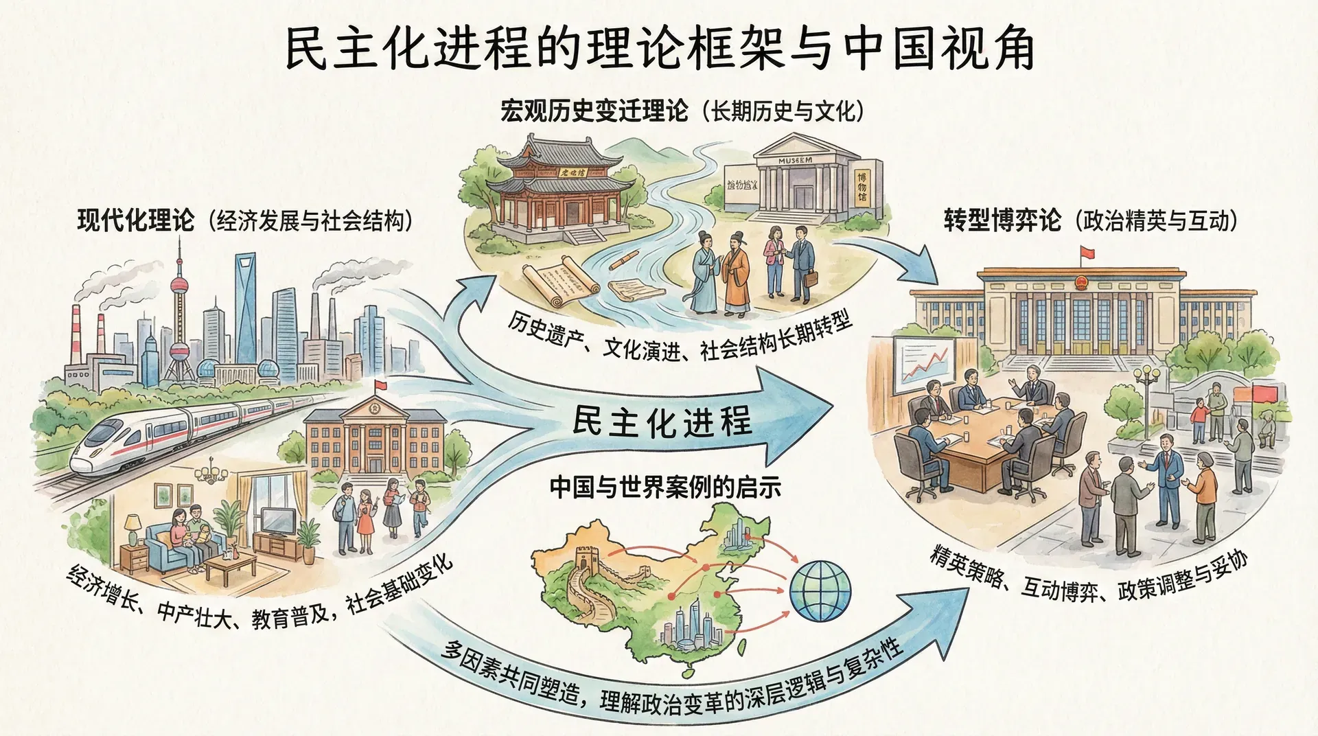 本章系统介绍了解释民主化现象的主要理论框架,包括现代化理论、宏观历史变迁理论、转型博弈论、民主建设理论以及国际维度分析。这些理论从不同角度揭示了民主化的动因、过程和结果。