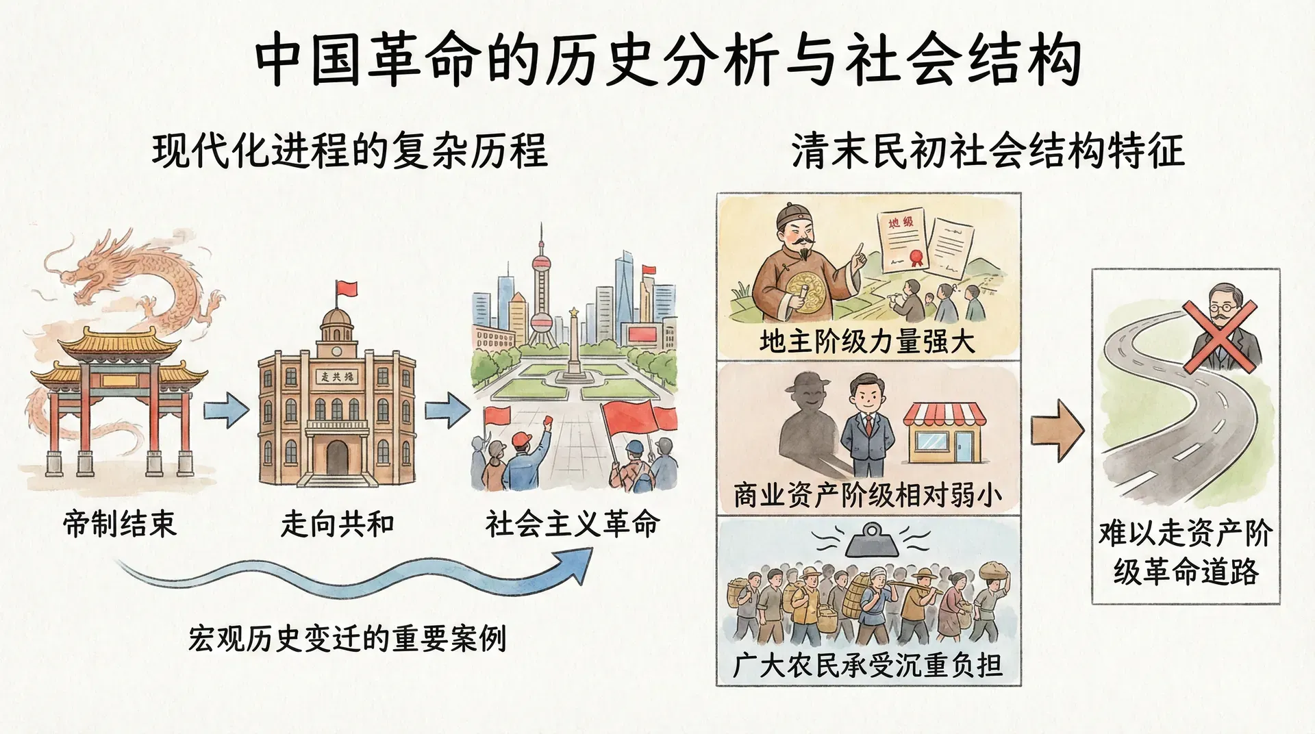 清末民初,中国的社会结构呈现出独特特征。传统的地主阶级力量强大,但商业资产阶级相对弱小。广大农民承受着沉重的租税负担,社会矛盾尖锐。这种社会结构决定了中国难以走资产阶级革命的道路。