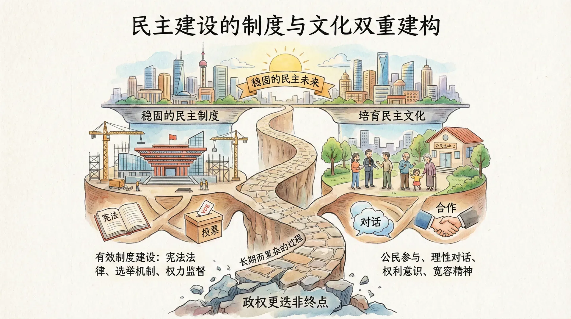 民主建设理论提醒我们,民主化不仅是政权更迭,更是制度建设和文化培育的长期过程。法治建设、制度完善、公民文化培育,都是民主巩固不可或缺的要素。