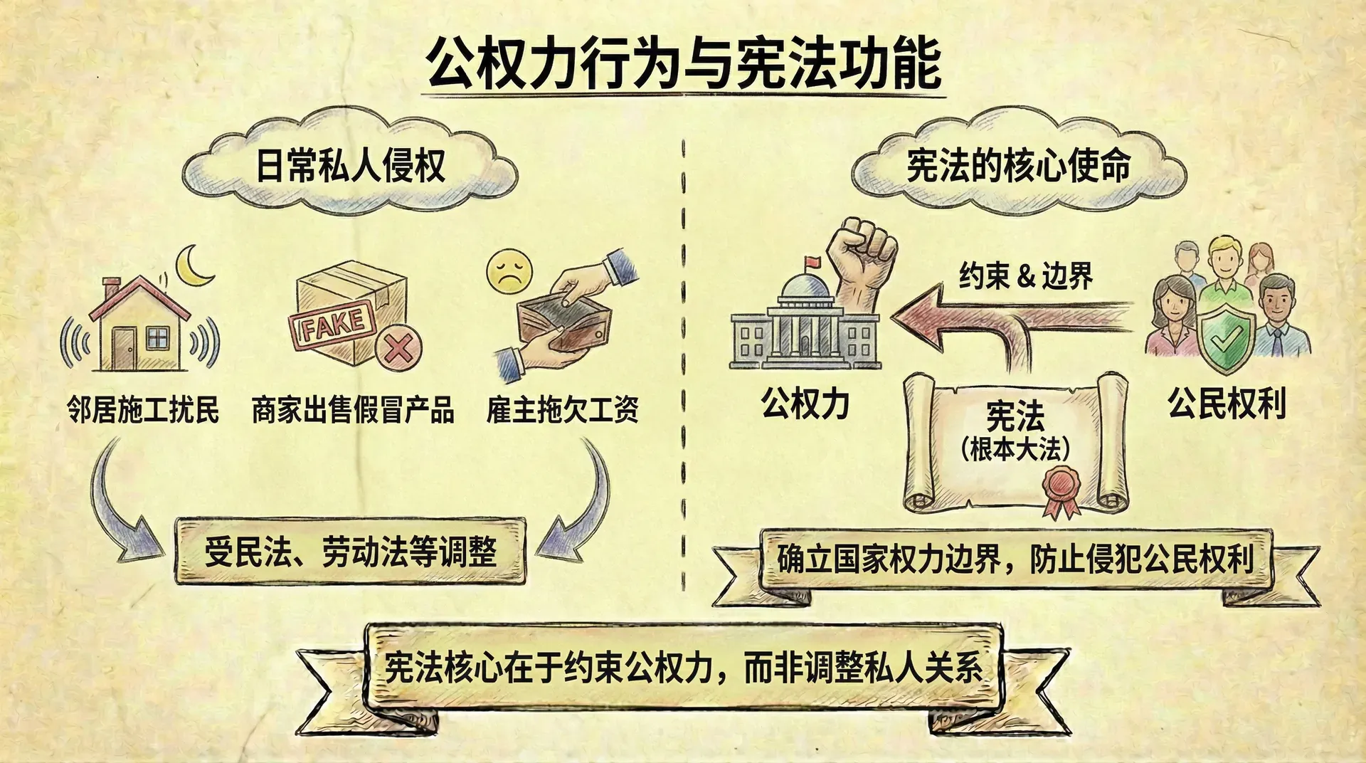 日常生活中,人们可能遭遇各种各样的权利侵害。邻居深夜施工影响休息,商家出售假冒伪劣产品,雇主拖欠工资——这些都是对权益的侵犯。然而,仔细审视宪法的条文和精神时,会发现一个重要的规律:宪法的核心功能是约束公权力,而非调整私人之间的关系。