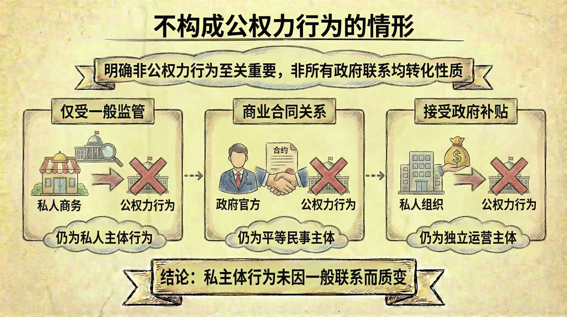 明确什么不构成公权力行为,与明确什么构成公权力行为同样重要。在实践中,有些人可能会误以为只要与政府有某种联系,私人主体的行为就会转化为公权力行为。这种理解是不正确的。