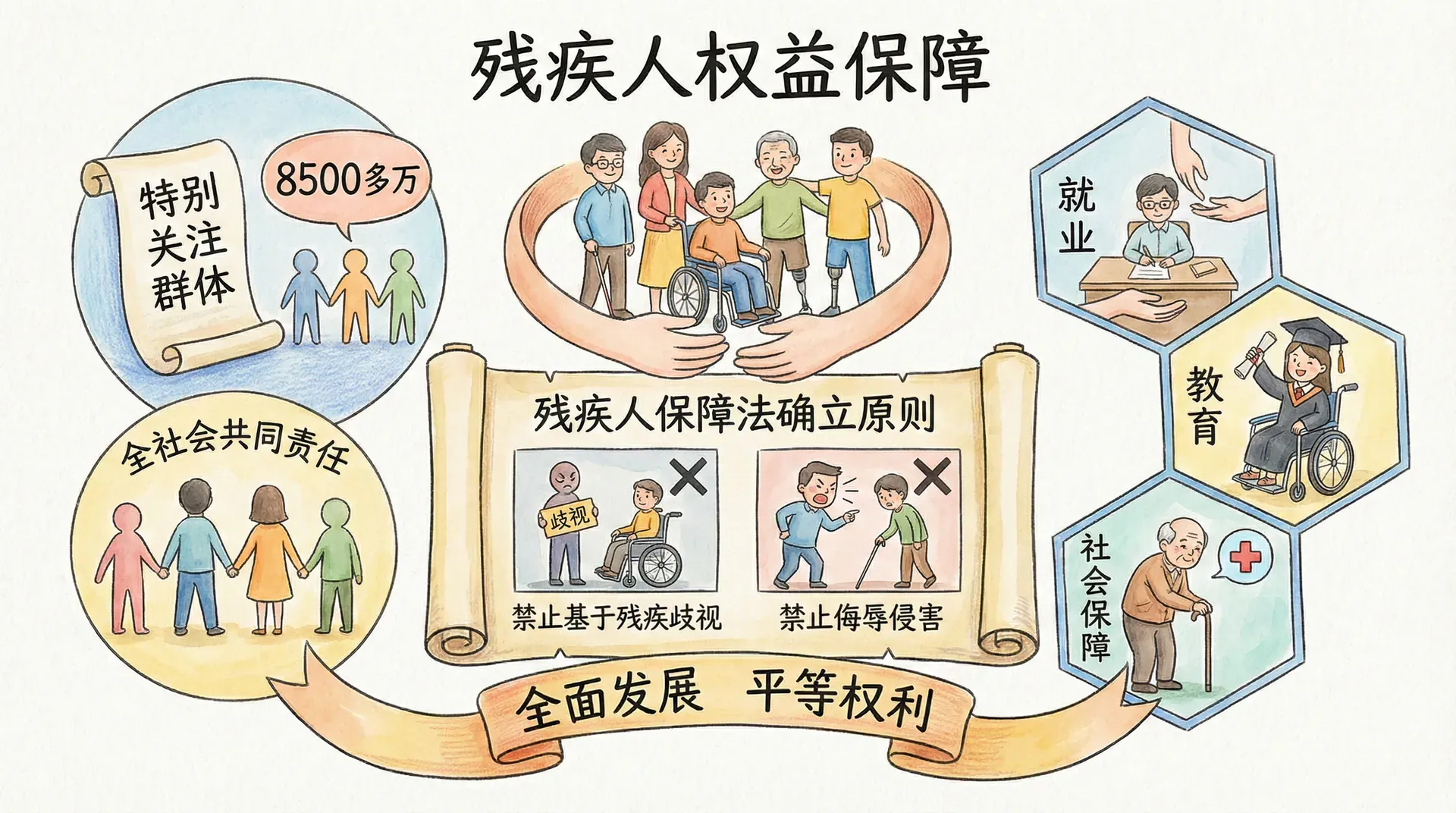 残疾人是需要特别关注和保护的群体。中国有8500多万残疾人,保障残疾人的平等权利、促进残疾人的全面发展,是全社会的共同责任。残疾人保障法确立了残疾人权益保护的基本原则和制度。