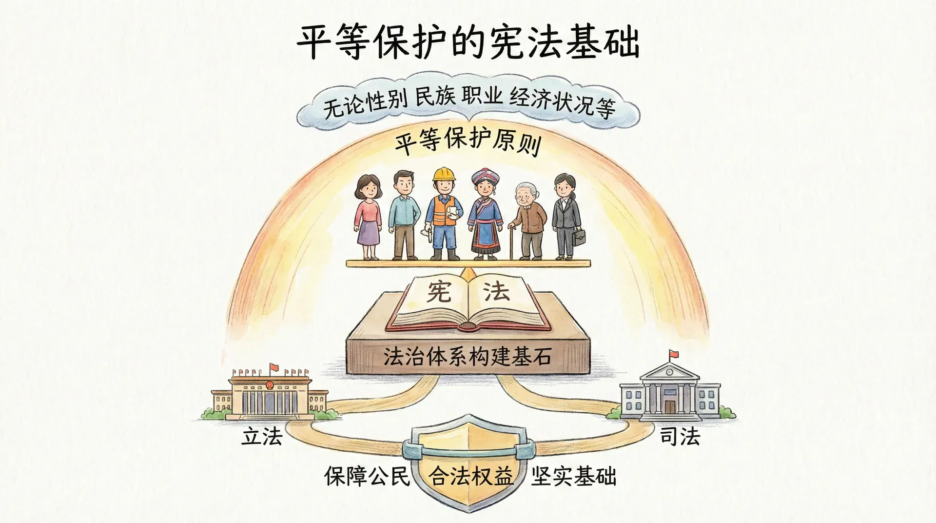 平等保护原则的根源在于宪法的明确规定,是中国法治体系构建的重要基石。宪法通过确立平等权,使每一位公民无论性别、民族、职业、经济状况等,在法律面前都享有平等的地位和权利。这一原则为我国各项立法和司法实践提供了根本遵循,也为国家有效保障公民合法权益奠定了坚实基础。