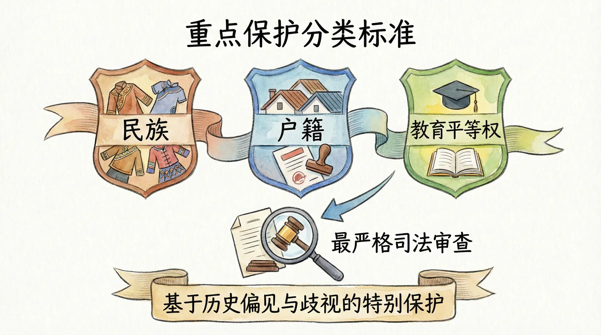 某些分类标准因其历史上与歧视和偏见的紧密联系,被法律赋予了特别的保护地位。当政府或其他主体基于这些标准进行差别对待时,必须接受最严格的司法审查。在中国,民族、户籍和教育平等权是最为突出的重点保护领域。