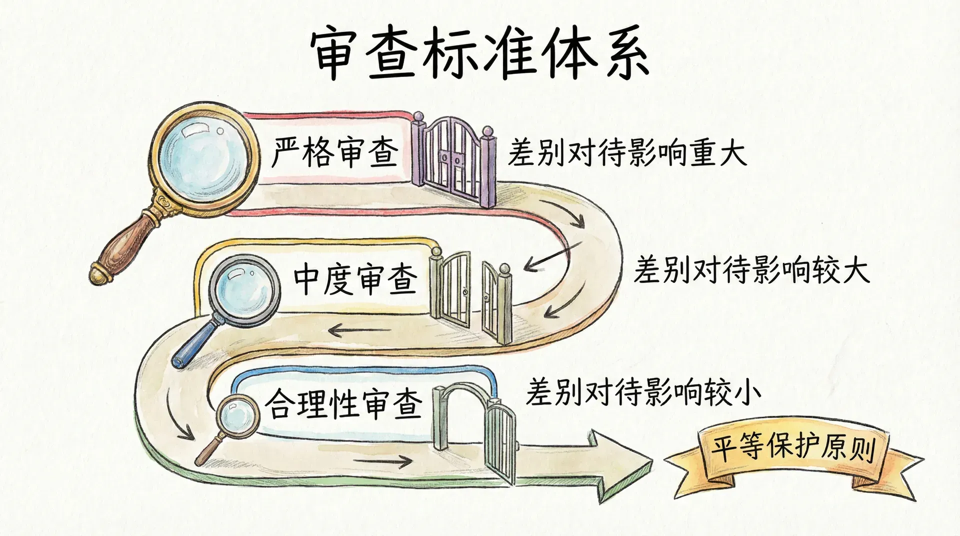 在判断一项法律规定或政策措施是否符合平等保护原则时,需要运用不同强度的审查标准。这种分层次的审查体系源于这样的认识:不同类型的差别对待对公民权利的影响程度不同,因此需要不同程度的司法审查。