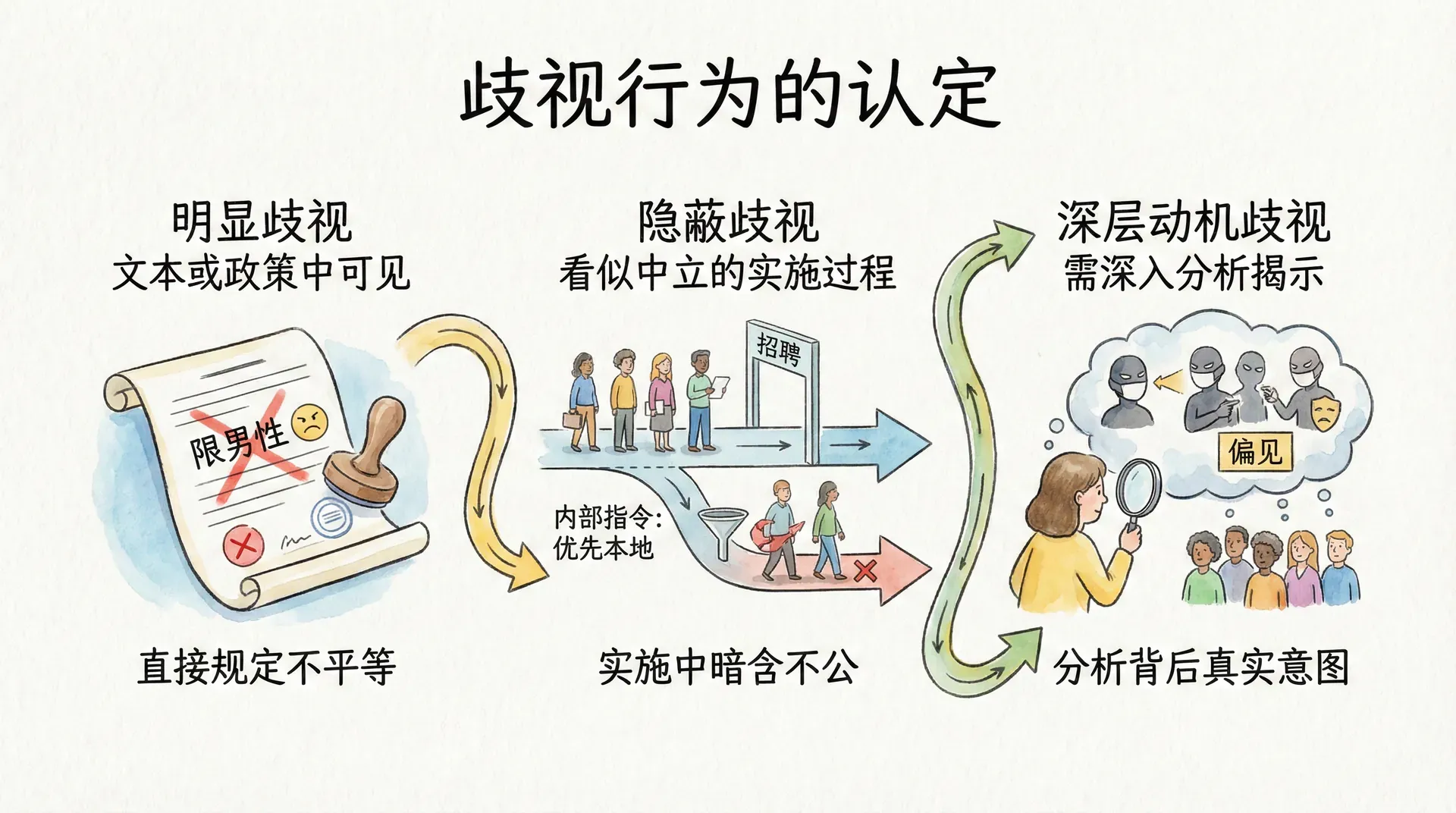 判断某项措施或行为是否构成歧视,并非总是一目了然。有些歧视明显表现在法律文本或政策规定中,有些则隐藏在看似中立的实施过程中,还有一些则需要通过深入分析才能揭示其背后的歧视动机。