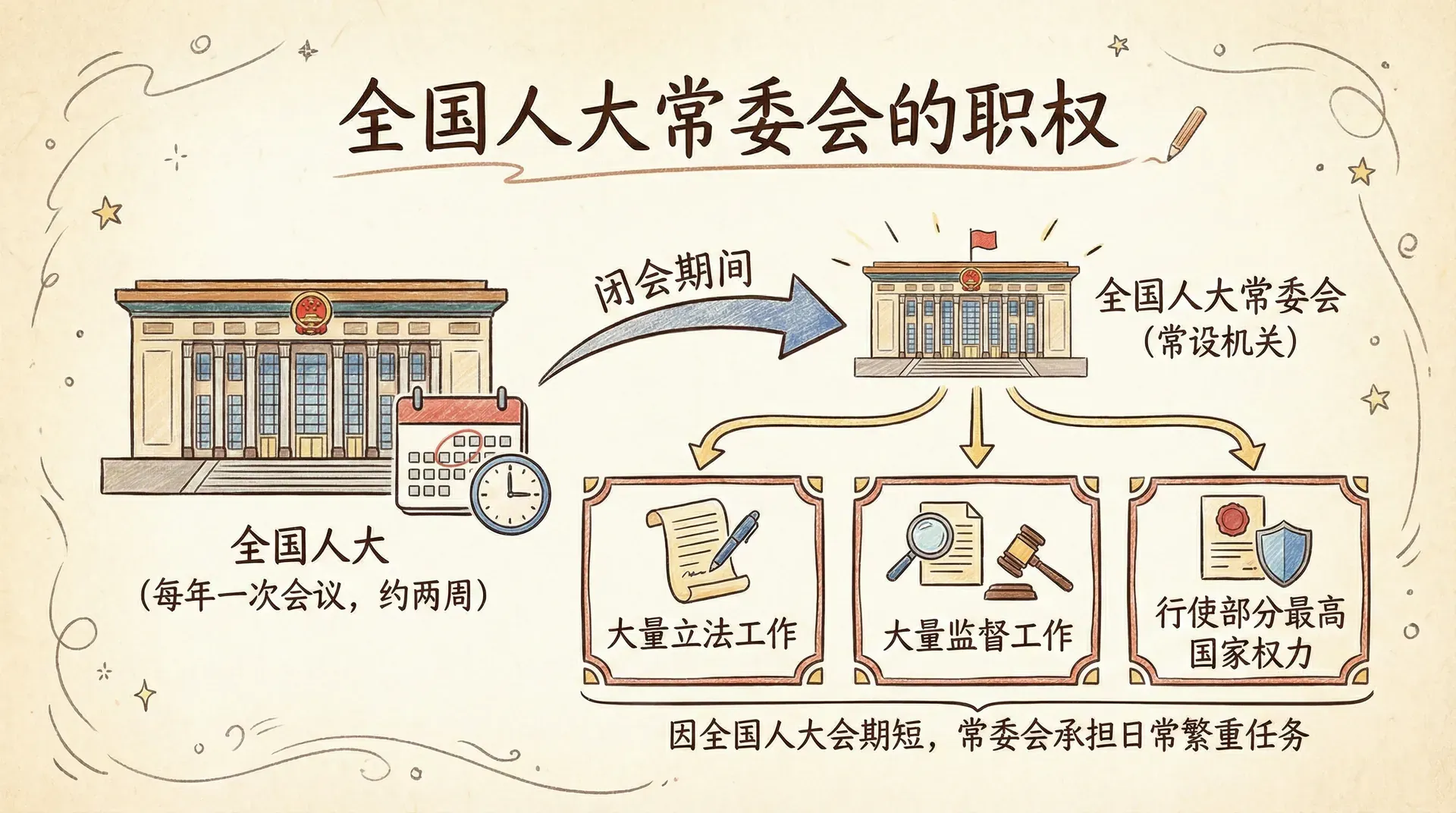 全国人大常委会是全国人大的常设机关,在全国人大闭会期间行使最高国家权力机关的部分职权。由于全国人大每年通常只召开一次会议,会期约两周,大量的立法和监督工作需要由常委会承担。