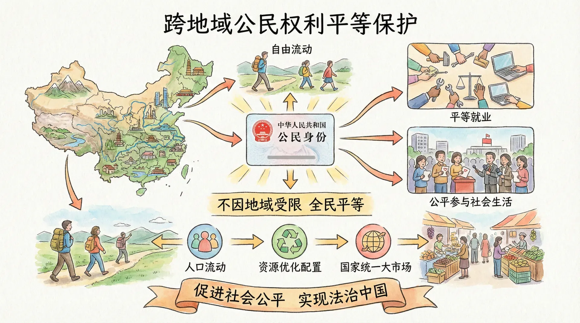 跨地域公民权利平等保护是指无论公民来自哪个省份、城市或地区,只要具备中华人民共和国公民身份,就应当在全国范围内平等享有法律所赋予的基本权利。这一原则保障了社会成员能够自由流动、平等就业和公平参与社会生活,不会因地域背景而受到不合理待遇。通过落实跨地域平等保护,可以促进人口流动、资源优化配置,并推动国家统一大市场的建设,是实现法治中国和社会公平的重要基础。