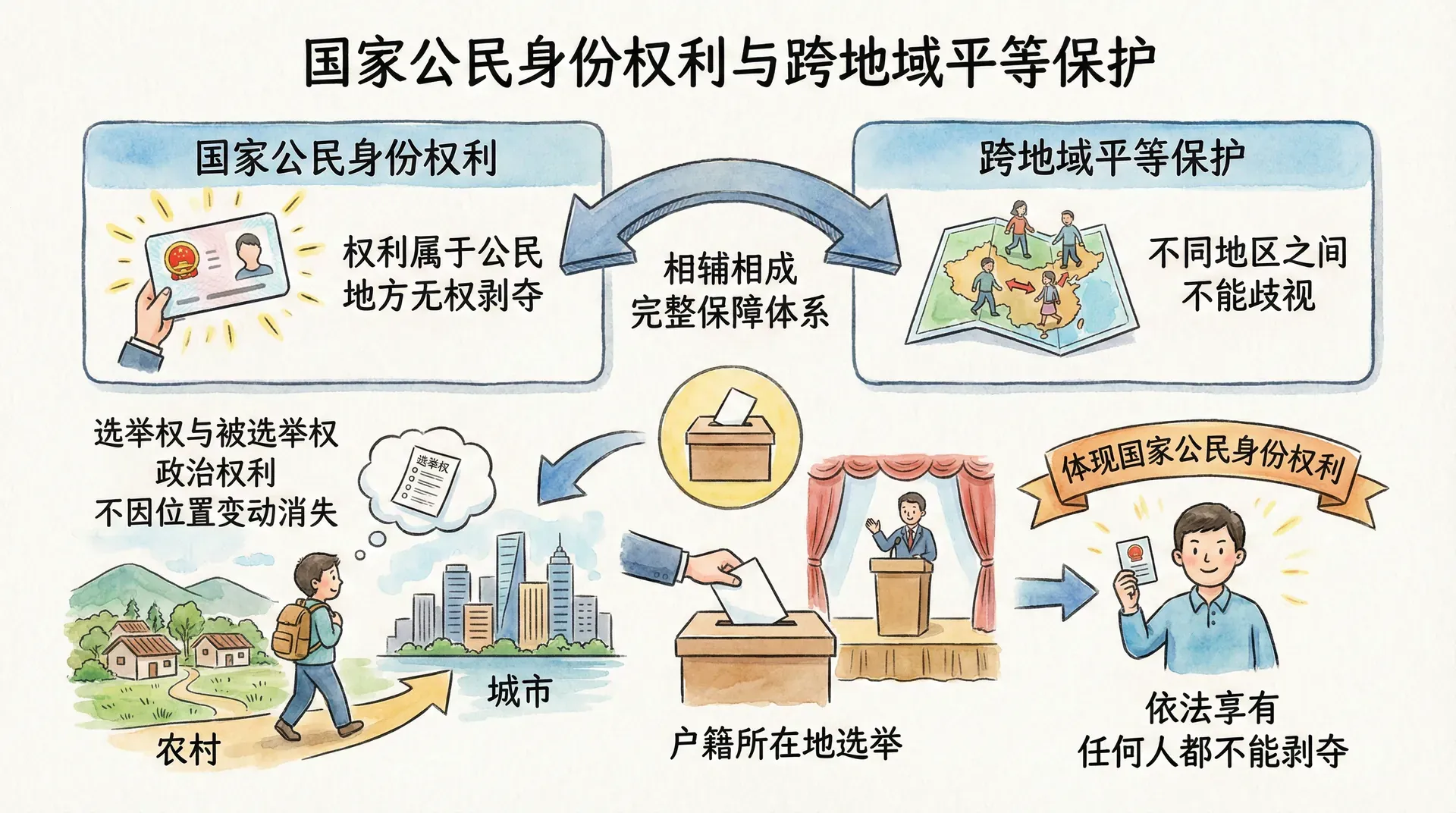 国家公民身份权利与跨地域平等保护有所不同。前者强调的是这些权利本身就属于国家公民,任何地方政府都无权剥夺或限制;后者强调的是在不同地区之间不能搞歧视。两者相辅相成,共同构成了完整的公民权利保障体系。