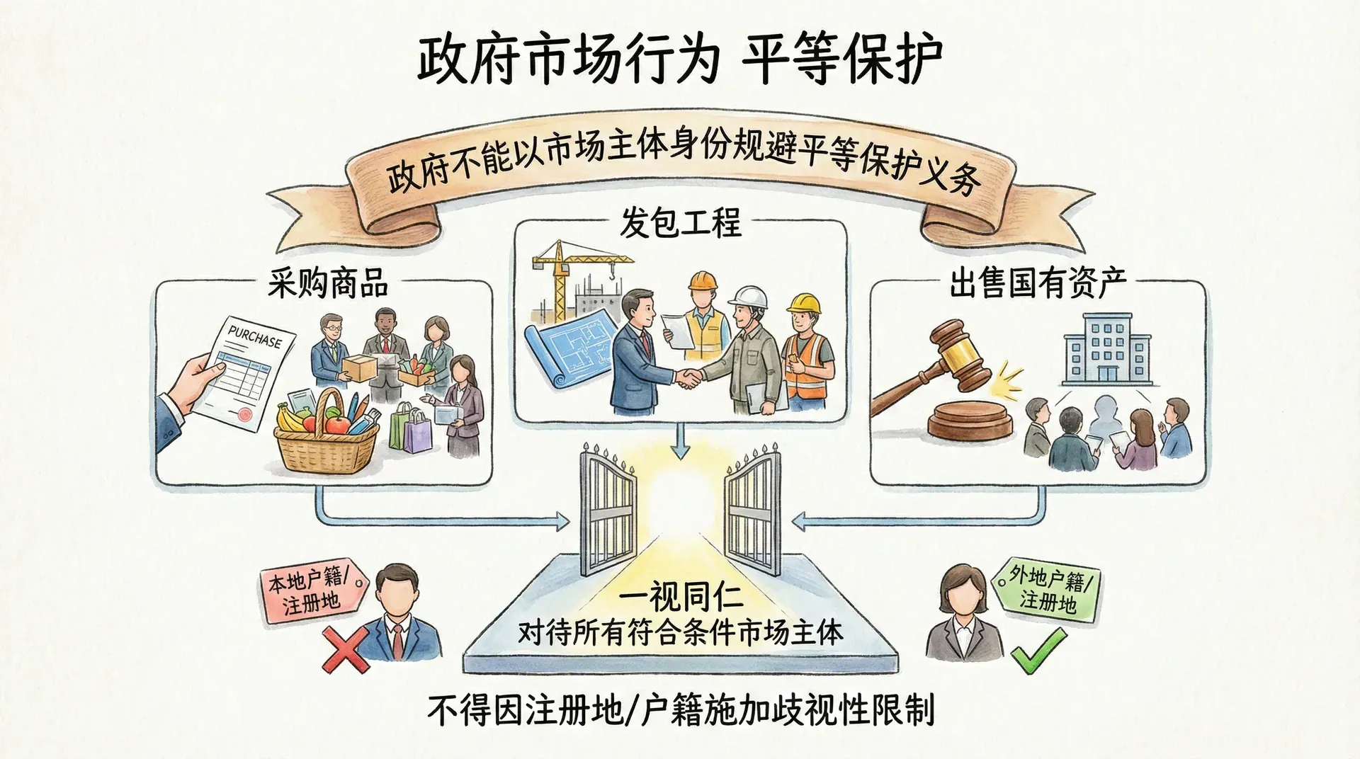 这传递出一个明确的信号:政府不能以市场主体身份为借口来规避平等保护义务。无论是采购商品、发包工程,还是出售国有资产,都应当一视同仁地对待所有符合条件的市场主体,不能因为其注册地或负责人户籍而施加歧视性限制。