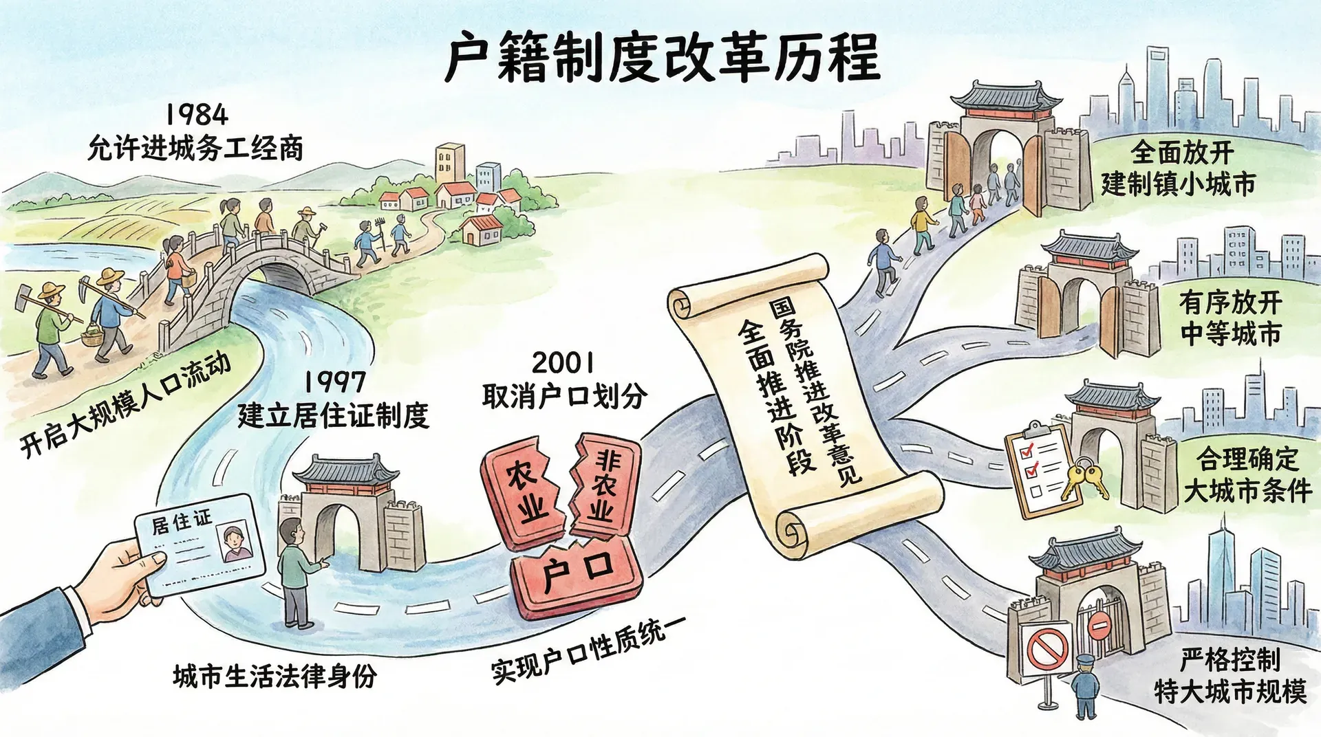 进入改革开放时期,随着市场经济的发展和劳动力流动的需要,户籍制度开始松动。1984年允许农民进城务工经商,开启了大规模的人口流动。1997年建立居住证制度,让外来人口在城市生活有了一定的法律身份。2001年取消了城镇户口中的农业户口和非农业户口划分,实现了户口性质的统一。