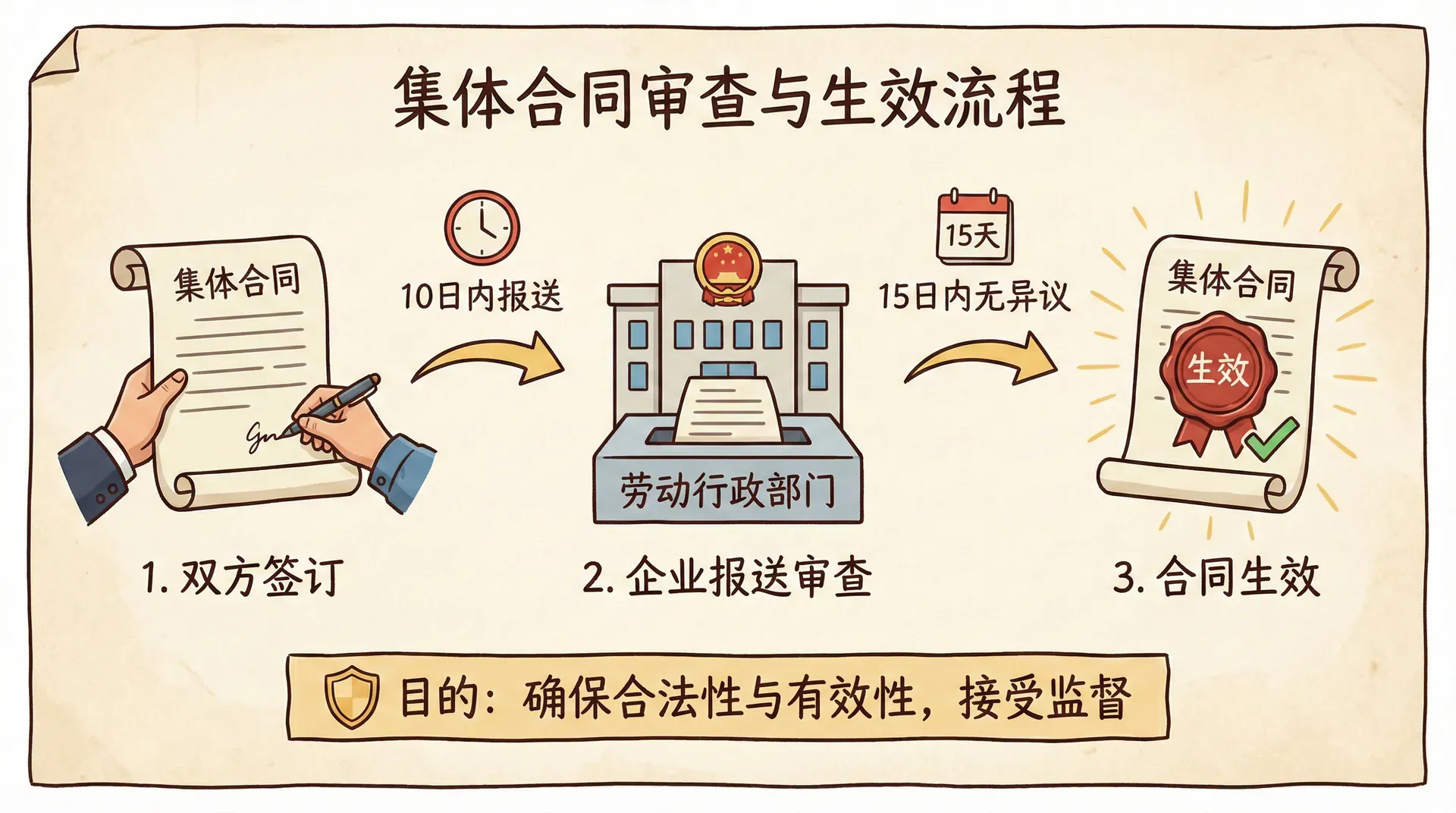 劳动行政部门审查是集体合同生效的必经程序。集体合同或专项集体合同签订后,应当自双方首席代表签字之日起十日内,由企业一方将集体合同文本报送劳动行政部门审查。劳动行政部门自收到集体合同文本之日起十五日内未提出异议的,集体合同即行生效。