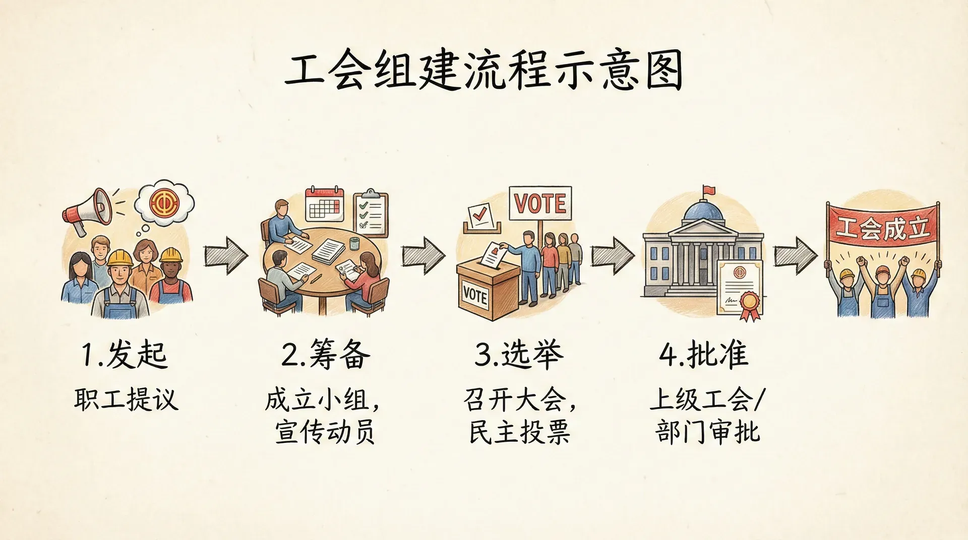 工会组建第一步是发起。企业职工可以自发组织,提出建立工会的动议。上级工会也可以指导和帮助企业职工组建工会。发起人一般应当是企业正式职工,具有一定组织能力和群众基础。发起建会后,需要征集一定数量职工的签名支持,通常要求不少于职工总数的一定比例。
