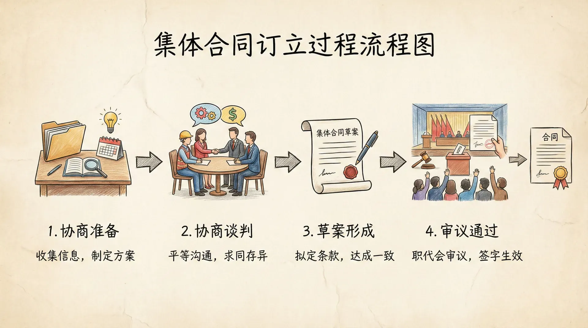 集体合同订立是一个民主协商的过程,需要劳资双方真诚合作和平等对话。订立集体合同一般经过以下几个阶段。