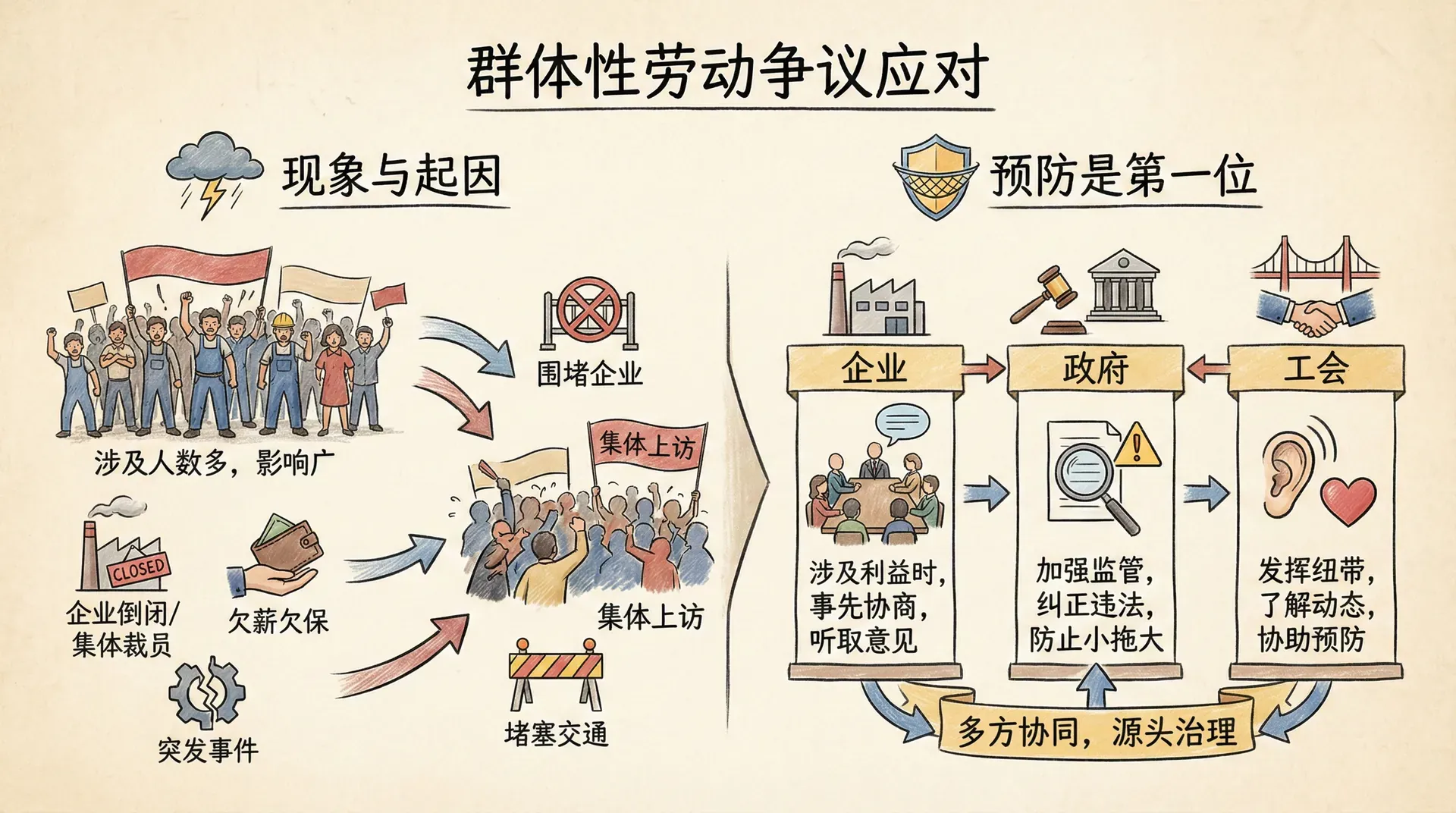 群体性劳动争议是指涉及人数众多、影响面广、可能引发群体性事件的劳动争议。这类争议往往起因于企业重大决策或突发事件,如企业倒闭、集体裁员、欠薪欠保等,职工情绪激动,容易采取集体上访、围堵企业、堵塞交通等过激行为。