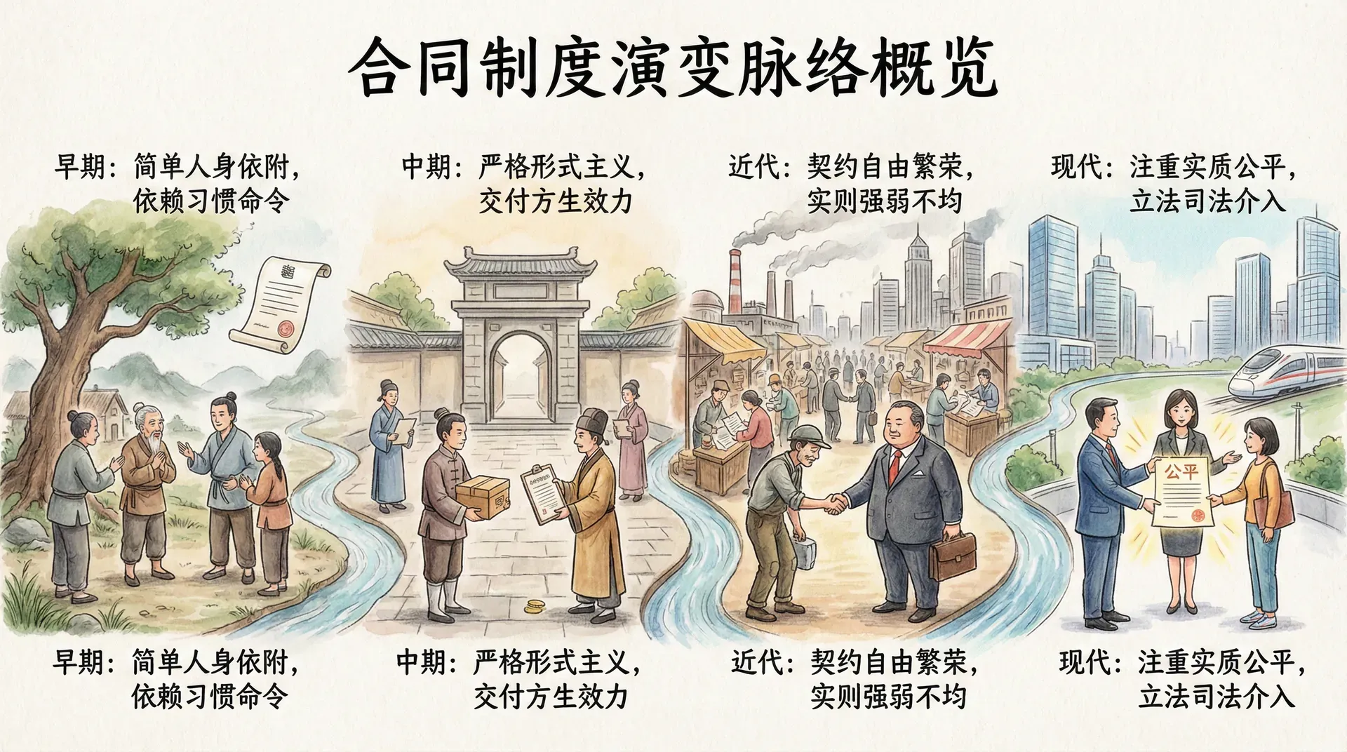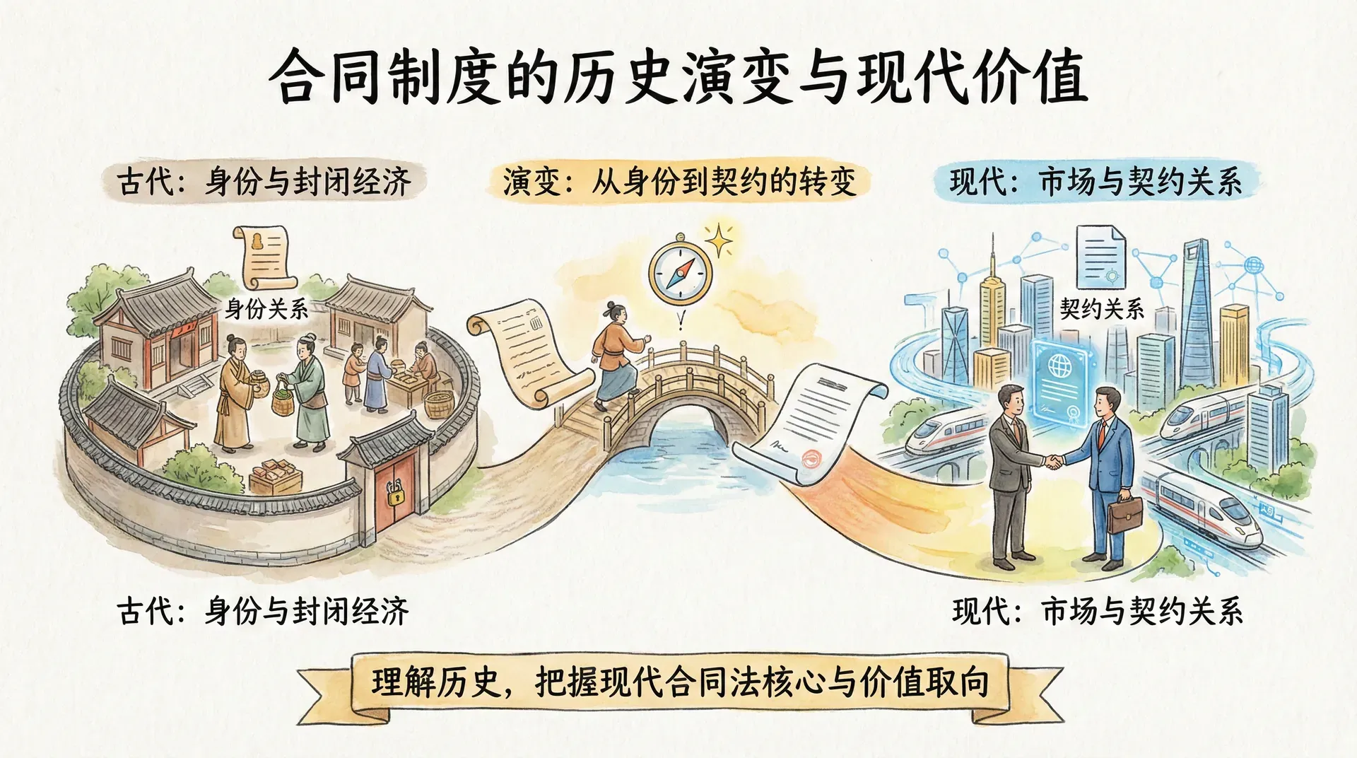 合同制度的发展历程是人类社会从身份关系到契约关系、从封闭经济到市场经济转变的缩影。追溯合同法的历史,可以帮助我们理解今天合同制度的基本原理和价值取向,认识现代合同法如何在传统与变革的交织中逐步形成。