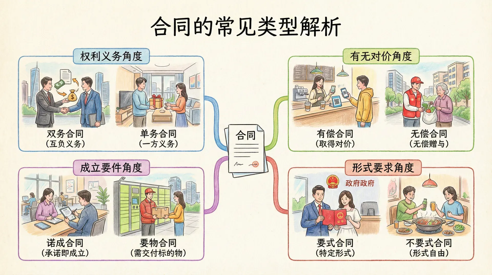 根据当事人取得权利是否需要偿付代价,合同可以分为有偿合同和无偿合同。有偿合同是指一方为获得权利必须向对方支付相应代价的合同。买卖、租赁、借贷等大多数合同都是有偿合同。无偿合同是指一方给予对方某种利益而不要求对方支付代价的合同,如赠与、无偿借用、无偿保管等。