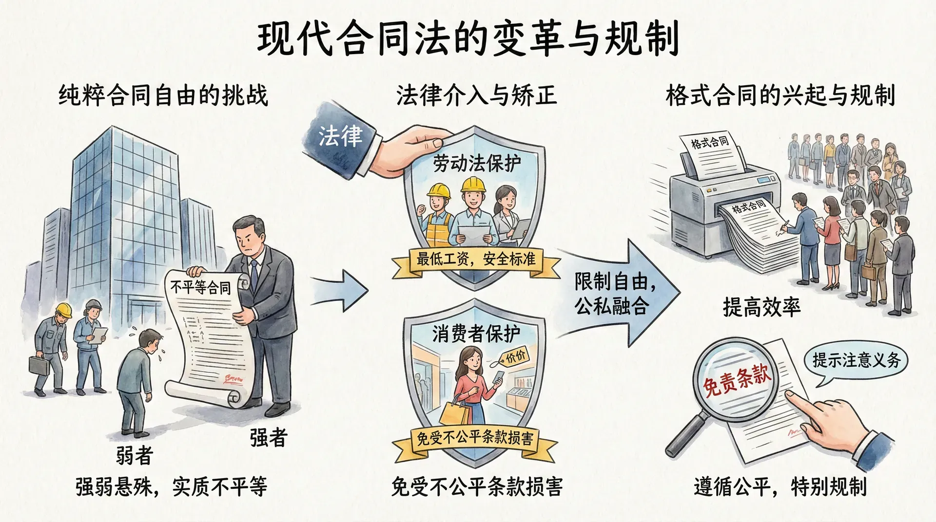 进入二十世纪,合同法面临着新的挑战和变革。纯粹的合同自由在实践中暴露出许多问题。形式上平等的合同当事人在经济实力上往往存在巨大差距,强者利用优势地位在合同中设置不公平条款,弱者处于被动接受的境地。资本家与工人之间的劳动合同、大企业与消费者之间的买卖合同往往存在严重的不平等。