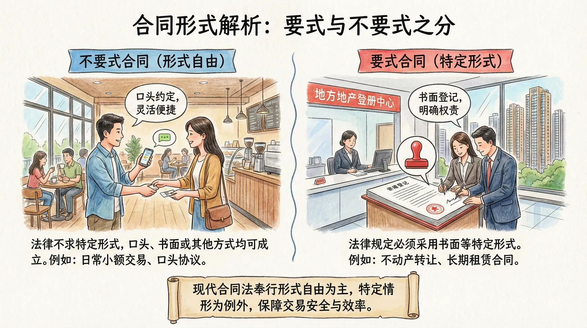 现代合同法奉行形式自由原则,一般不要求合同采用特定形式。当事人可以采用书面形式、口头形式或其他形式订立合同。但出于特殊政策考虑,法律对某些合同规定了形式要求。不动产转让合同必须采用书面形式,这是因为不动产价值较大,法律关系复杂,书面形式有利于明确当事人的权利义务,减少纠纷。
