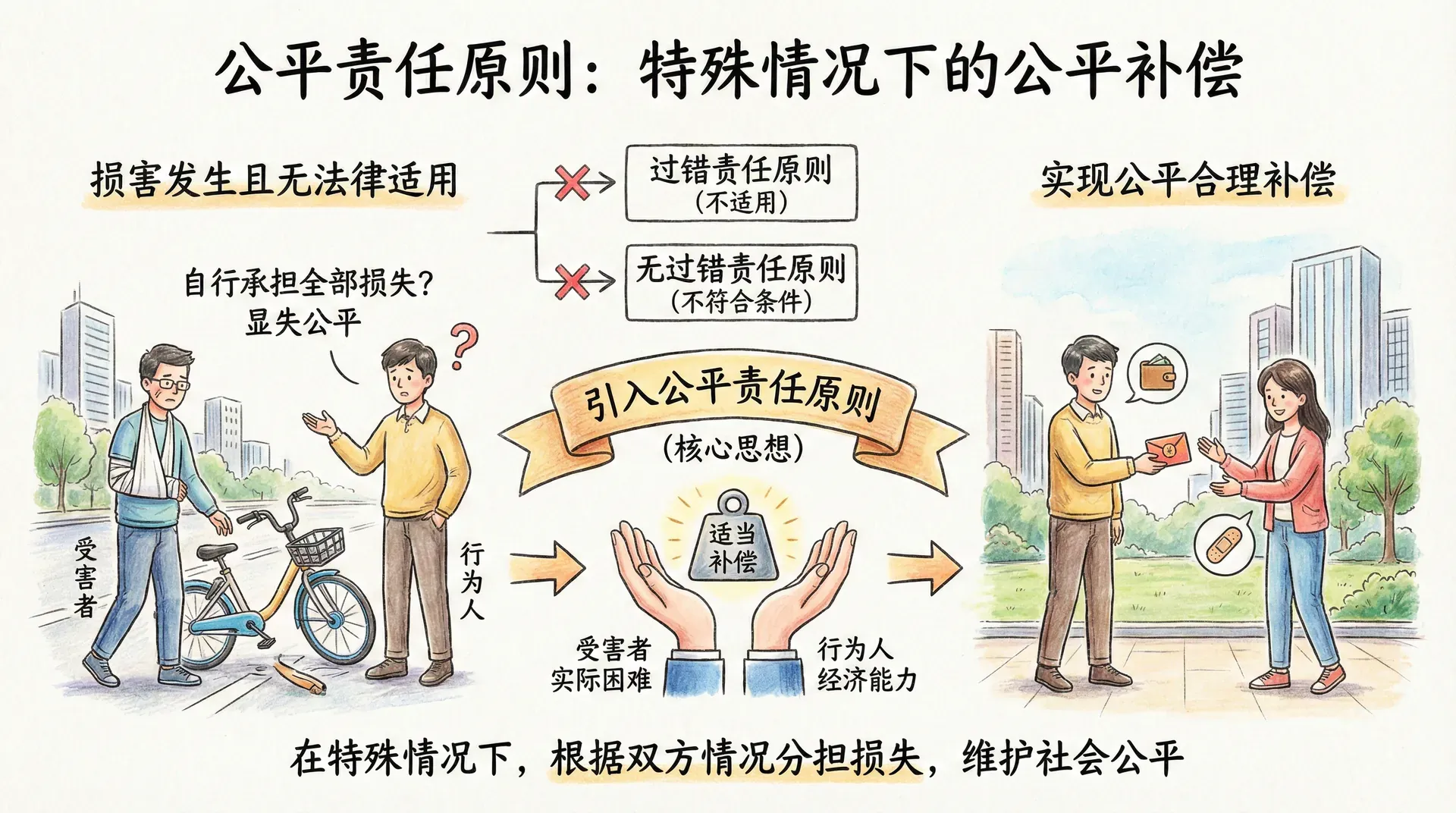 在司法实践中,还会遇到这样的情况:损害已经发生,受害者确实需要补偿,但按照过错责任原则,行为人不应承担责任;按照无过错责任原则,情况又不符合适用条件。在这种情况下,如果让受害者自己承担全部损失,显然不够公平。于是,公平责任原则应运而生。