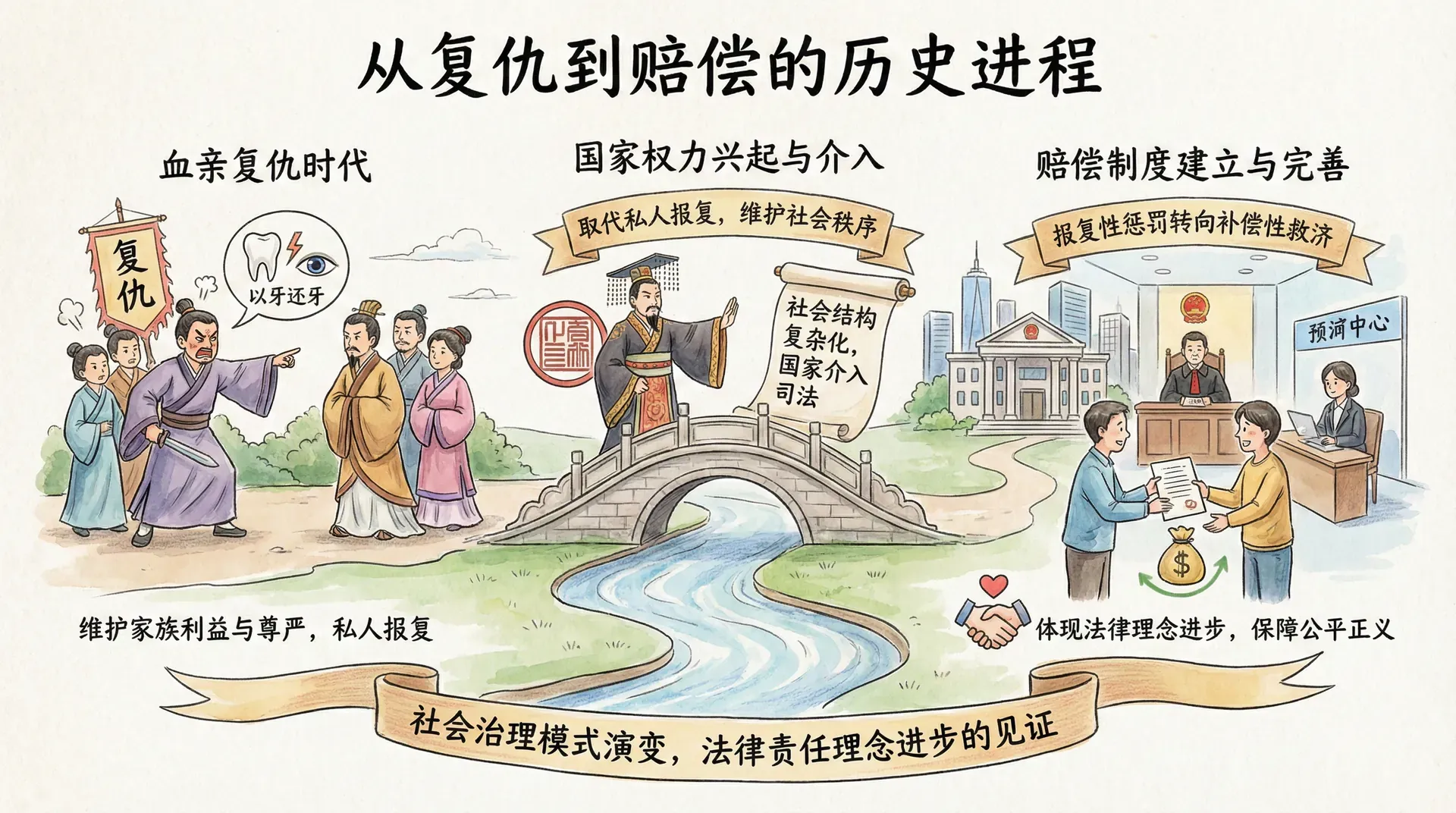 国家逐步介入司法,取代私人报复,最终推动了赔偿制度的建立,实现了从报复性惩罚到补偿性救济的历史性转变。这一进程不仅反映了社会治理模式的演变,也体现了法律责任理念的进步。