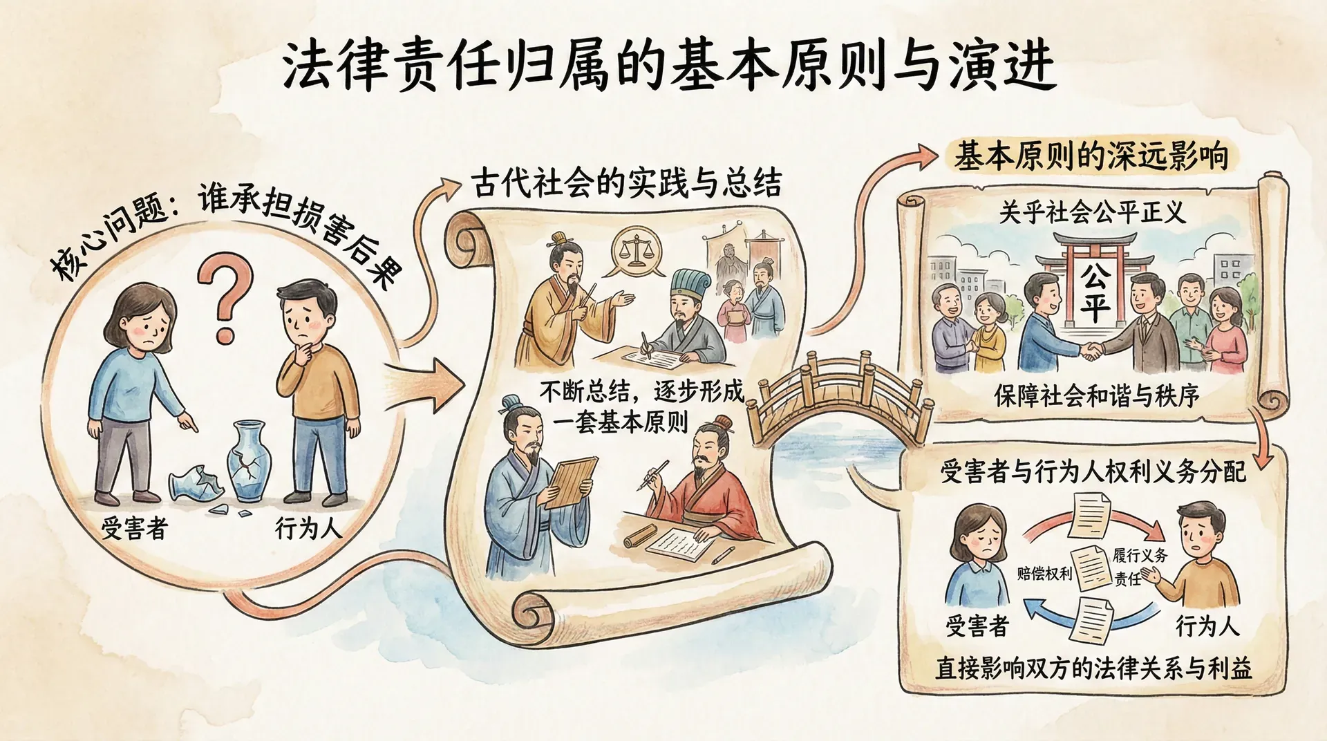 在法律责任体系中,确定由谁承担损害后果是最核心的问题之一。古代社会在实践中不断总结和发展,逐步形成了一套关于责任归属的基本原则。这些原则不仅关乎社会公平正义,也直接影响到受害者与行为人之间的权利与义务分配。